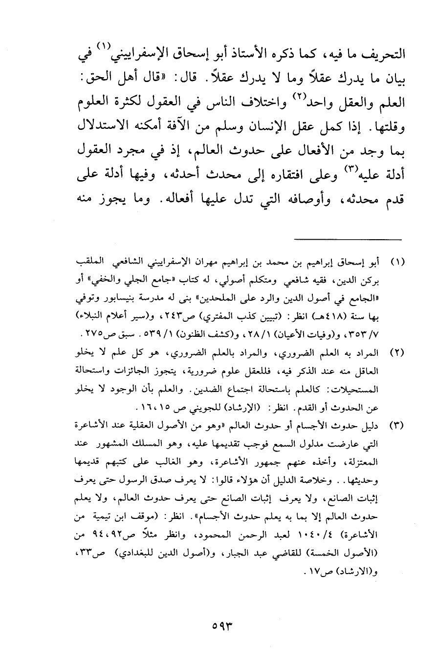 التحريف ما فيه كما ذكره الأستاذ أبو إسحاق الإسفراييني في بيان ما يدرك عقلاً وما لا يدرك عقلاً قال قال أهل الحق العلم والعقل واحد واختلاف الناس في العقول لكثرة العلوم وقلتها إذا كمل عقل الإنسان وسلم من الآفة أمكنه الاستدلال بما وجد من الأفعال على حدوث العالم إذ في مجرد العقول أدلة عليه وعلى افتقاره إلى محدث أحدثه وفيها أدلة على قدم محدثه وأوصافه التي تدل عليها أفعاله وما يجوز منه