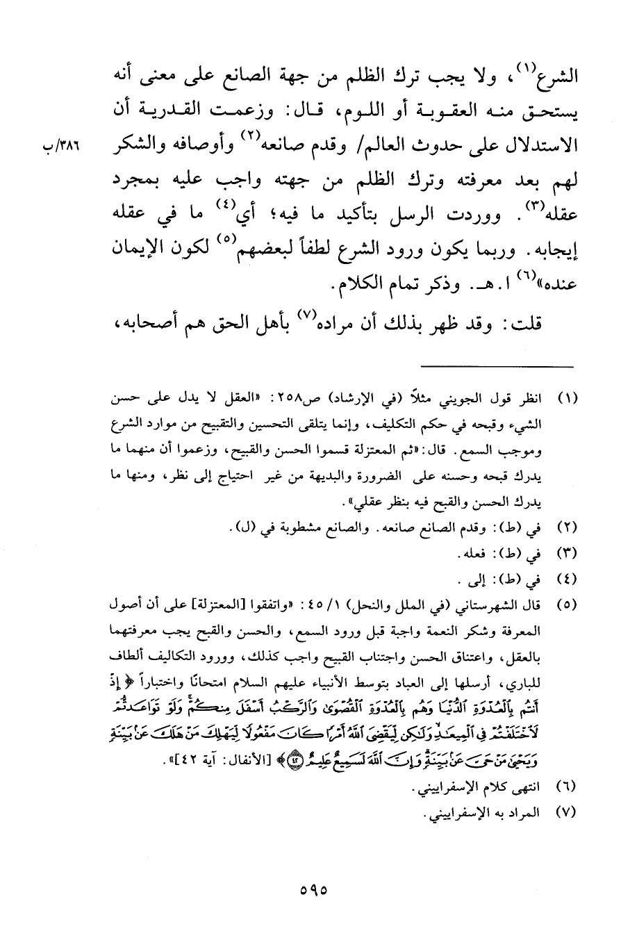 الشرع ولا يجب ترك الظلم من جهة الصانع على معنى أنه يستحق منه العقوبة أو اللوم قال وزعمت القدرية أن الاستدلال على حدوث العالم وقدم صانعه وأوصافه والشكر لهم بعد معرفته وترك الظلم من جهته واجب عليه بمجرد عقله ووردت الرسل بتأكيد ما فيه أي ما في عقله إيجابه وربما يكون ورود الشرع لطفاً لبعضهم لكون الإيمان عنده اهـ وذكر تمام كلامه قلت وقد ظهر بذلك أن مراده بأهل الحق هم أصحابه