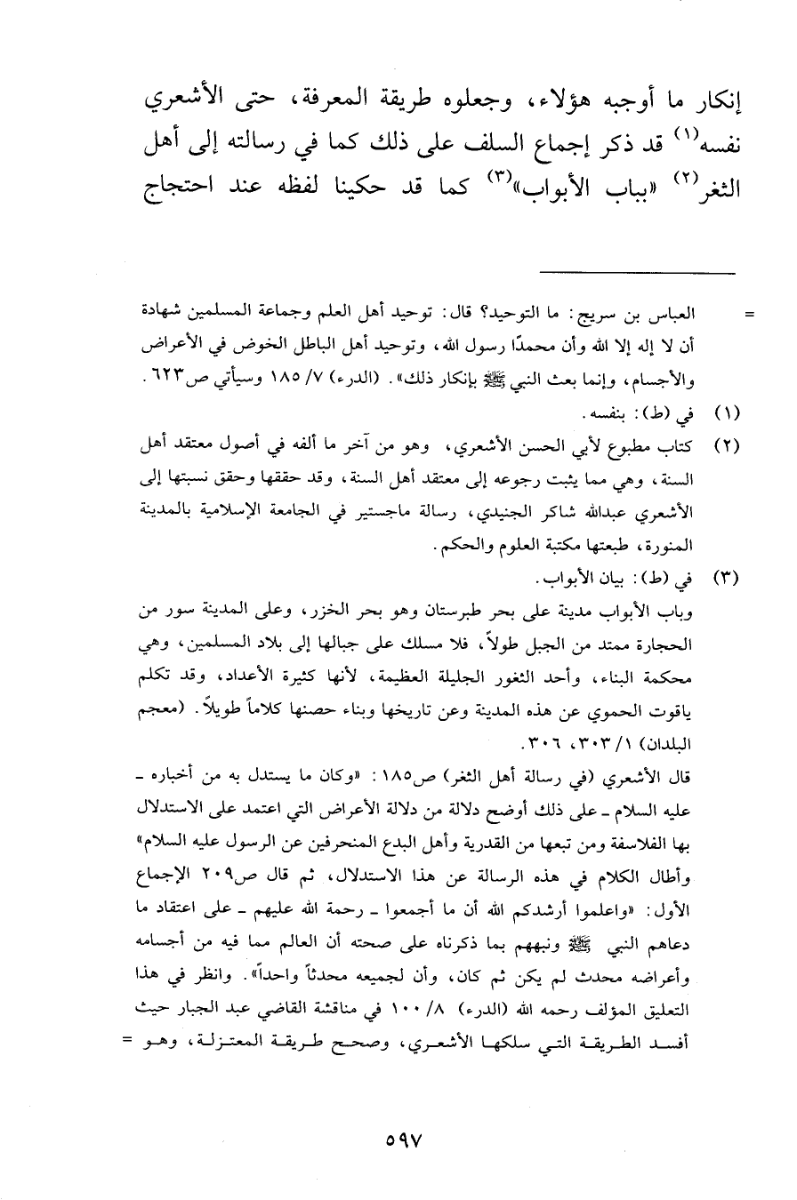 إنكار ما أوجبه هؤلاء وجعلوه طريقة المعرفة حتى الأشعري نفسه قد ذكر إجماع السلف على ذلك كما في رسالته إلى أهل الثغر بباب الأبواب كما قد حكينا لفظه عند احتجاج
