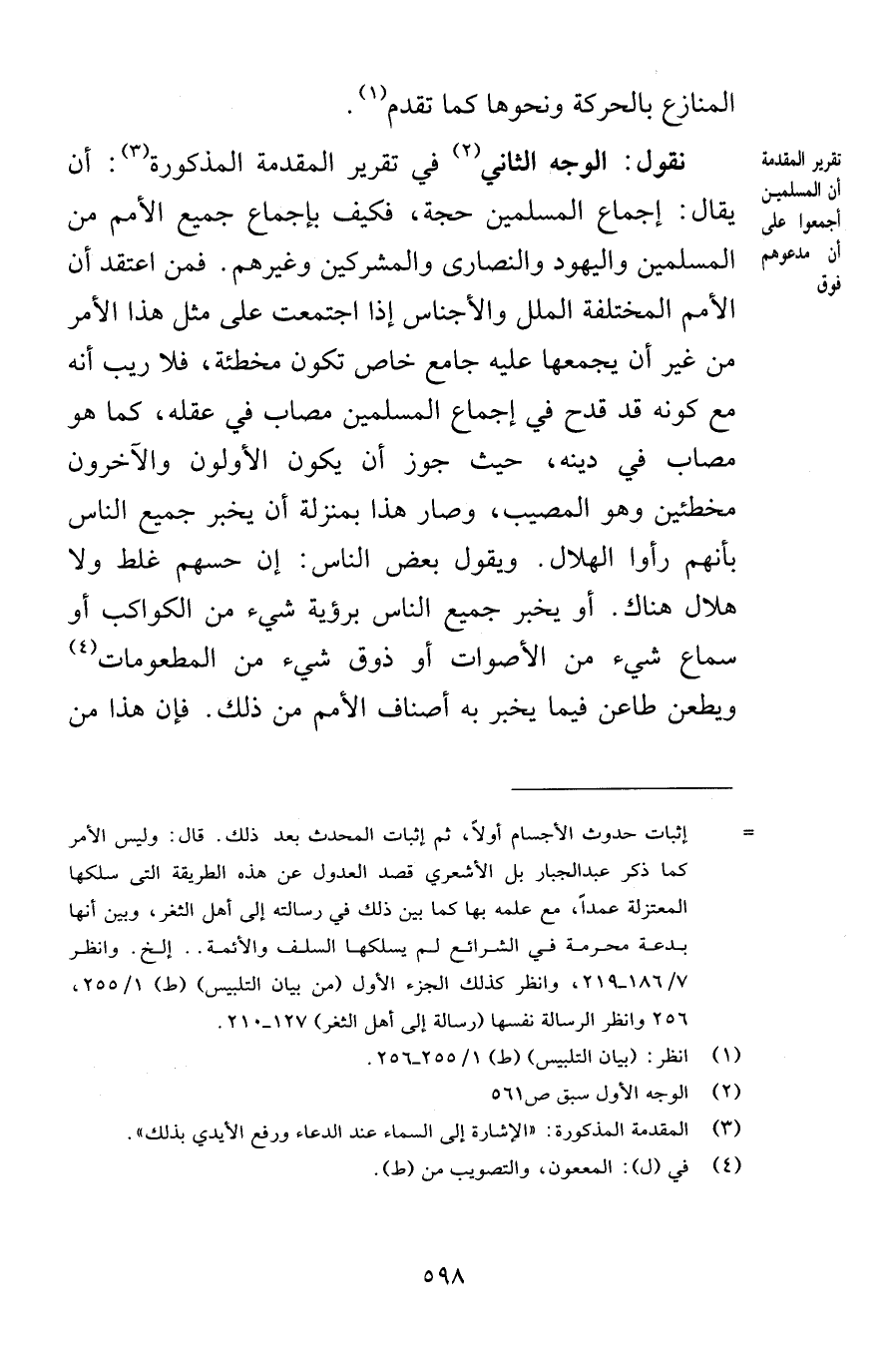 المنازع بالحركة ونحوها كما تقدم نقول الوجه الثاني في تقرير المقدمة المذكورة أن يقال إجماع المسلمين حجة فكيف بإجماع جميع الأمم من المسلمين واليهود والنصارى والمشركين وغيرهم فمن اعتقد أن الأمم المختلفة الملل والأجناس إذا اجتمعت على مثل هذا الأمر من غير أن يجمعها عليه جامع خاص تكون مخطئة فلا ريب أنه مع أنه قد قدح في إجماع المسلمين مصاب في عقله كما هو مصاب في دينه حيث جوز أن يكون الأولون والآخرون مخطئين وهو المصيب وصار هذا بمنزلة أن يخبر جميع الناس بأنهم رأوا الهلال ويقول بعض الناس إن حسهم غلط ولا هلال هناك أو يخبر جميع الناس برؤية شيء من الكواكب أو سماع شيء من الأصوات أو ذوق شيء من المطعومات ويطعن طاعن فيما يخبر به أصناف الأمم من ذلك فإن هذا من