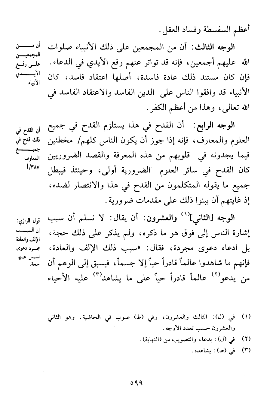 أعظم السفسطة وفساد العقل الوجه الثالث أن من المجمعين على ذلك الأنبياء صلوات الله عليهم أجمعين فإنه قد تواتر عنهم رفع الأيدي في الدعاء فإن كان مستند ذلك عادة فاسدة أصلها اعتقاد فاسد كان الأنبياء قد وافقوا الناس على الدين الفاسد والاعتقاد الفاسد في الله تعالى وهذا من أعظم الكفر الوجه الرابع أن القدح في هذا يستلزم القدح في جميع العلوم والمعارف فإنه إذا جوز أن يكون الناس كلهم مخطئين فيما يجدونه في قلوبهم من هذه المعرفة والقصد الضروريين كان القدح في سائر العلوم الضرورية أولى وحينئذ فيبطل جميع ما يقوله المتكلمون من القدح في هذا والانتصار لضده إذ غايتهم أن يبنوا ذلك على مقدمات ضرورية الوجه الثاني والعشرون أن يقال لا نسلم أن سبب إشارة الناس إلى فوق هو ما ذكره ولم يذكر على ذلك حجة بل ادعاه دعوى مجردة فقال سبب ذلك الإلف والعادة فإنهم ما شاهدوا عالماً قادراً حياً إلا جسماً فيسبق إلى الوهم أن من يدعو عالماً قادراً حياً على ما يشاهد عليه الأحياء