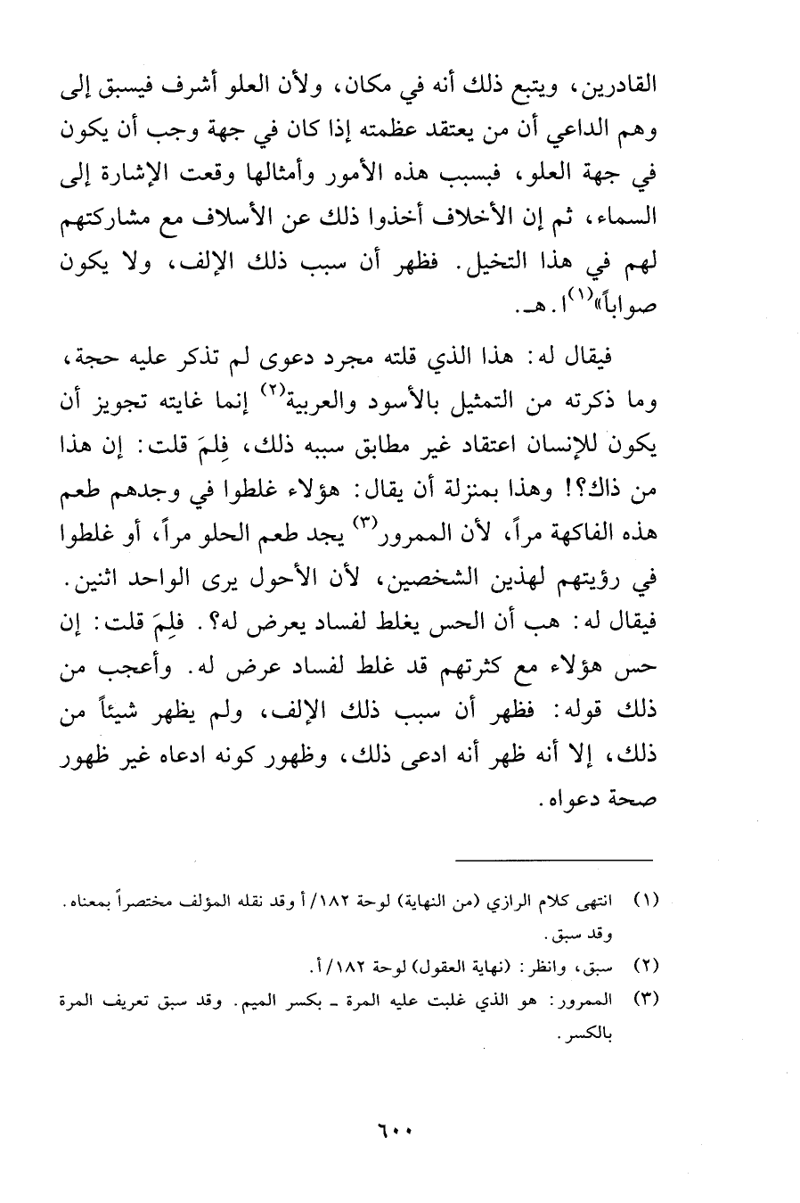 القادرين ويتبع ذلك أنه في مكان ولأن العلو أشرف فيسبق إلى وهم الداعي أن من يعتقد عظمته إذا كان في جهة وجب أن يكون في جهة العلو فبسبب هذه الأمور وأمثالها وقعت الإشارة إلى السماء ثم إن الأخلاف أخذوا ذلك عن الأسلاف مع مشاركتهم لهم في هذا التخيل فظهر أن سبب ذلك الإلف ولا يكون صواباً اهـ فيقال له هذا الذي قلته مجرد دعوى لم تذكر عليه حجة وما ذكرته من التمثيل بالأسود والعربية إنما غايته تجويز أن يكون للإنسان اعتقاد غير مطابق سببه ذلك فِلمَ قلت إن هذا من ذاك وهذا بمنزلة أن يقال هؤلاء غلطوا في وجدهم طعم هذه الفاكهة مراً لأن الممرور يجد طعم الحلو مراً أو غلطوا في رؤيتهم لهذين الشخصين لأن الأحول يرى الواحد اثنين فيقال له هب أن الحس يغلط لفساد يعرض له فلِمَ قلت إن حس هؤلاء مع كثرتهم قد غلط لفساد عرض له وأعجب من ذلك قوله فظهر أن سبب ذلك الإلف ولم يظهر شيئاً من ذلك إلا أنه ظهر أنه ادعى ذلك وظهور كونه ادعاه غير ظهور صحة دعواه