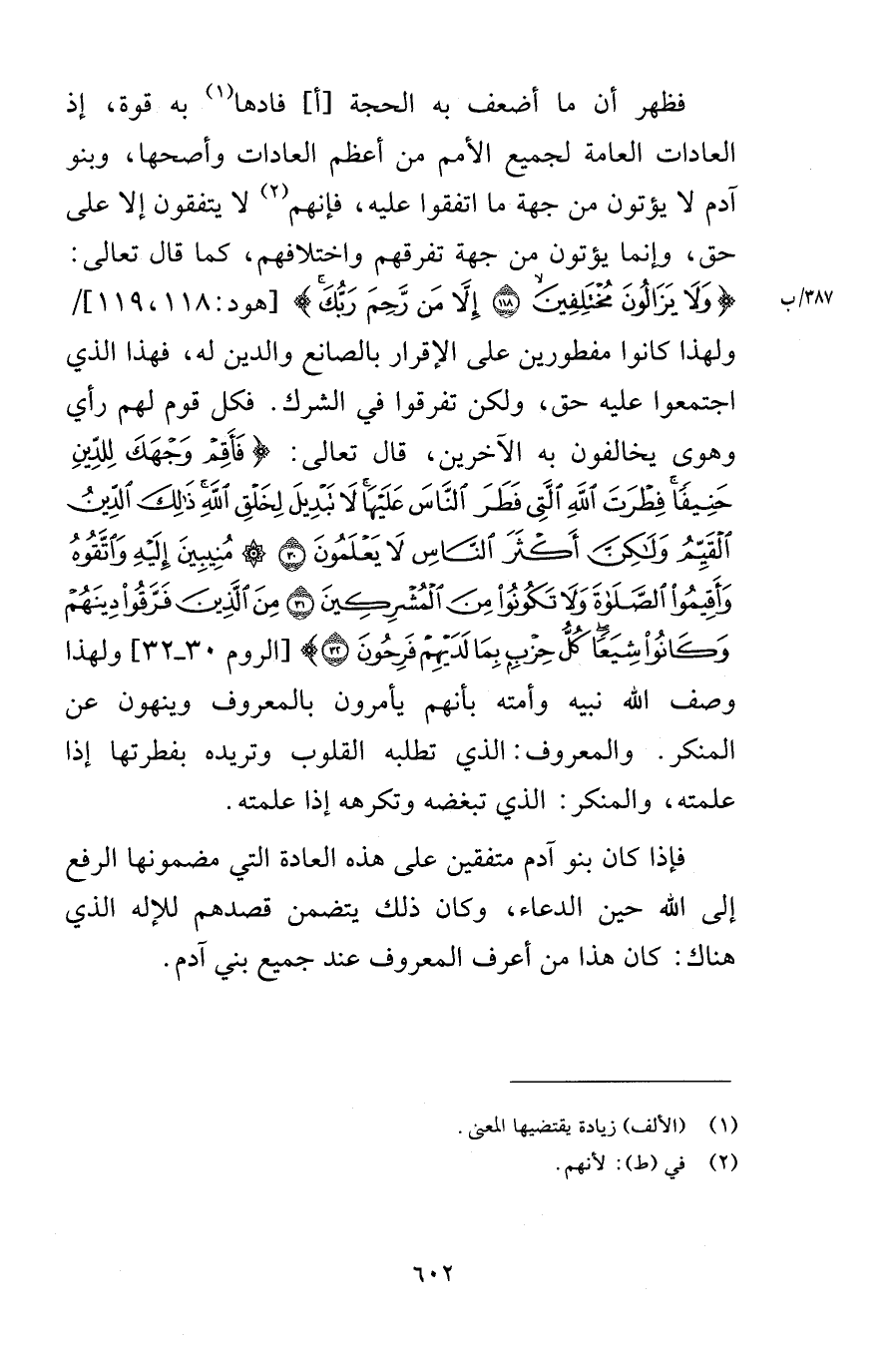 فظهر أن ما أضعف به الحجة أفادها به قوة إذ العادات العامة لجميع الأمم من أعظم العادات وأصحها وبنو آدم لا يأتون من جهة ما اتفقوا عليه فإنهم لا يتفقون إلا على حق وإنما يأتون من جهة تفرقهم واختلافهم كما قال تعالى وَلاَ يَزَالُونَ مُخْتَلِفِينَ {118} إِلاَّ مَن رَّحِمَ رَبُّكَ [هود 118-119] ولهذا كانوا مفطورين على الإقرار بالصانع والدين له فهذا الذي اجتمعوا عليه حق ولكن تفرقوا في الشرك فكل قوم لهم رأي وهوى يخالفون به الآخرين قال تعالى فَأَقِمْ وَجْهَكَ لِلدِّينِ حَنِيفاً فِطْرَةَ اللَّهِ الَّتِي فَطَرَ النَّاسَ عَلَيْهَا لَا تَبْدِيلَ لِخَلْقِ اللَّهِ ذَلِكَ الدِّينُ الْقَيِّمُ وَلَكِنَّ أَكْثَرَ النَّاسِ لَا يَعْلَمُونَ {30} مُنِيبِينَ إِلَيْهِ وَاتَّقُوهُ وَأَقِيمُوا الصَّلَاةَ وَلَا تَكُونُوا مِنَ الْمُشْرِكِينَ {31} مِنَ الَّذِينَ فَرَّقُوا دِينَهُمْ وَكَانُوا شِيَعاً كُلُّ حِزْبٍ بِمَا لَدَيْهِمْ فَرِحُونَ {32} [الروم 30-32] ولهذا وصف الله نبيه وأمته بأنهم يأمرون بالمعروف وينهون عن المنكر والمعروف الذي تطلبه القلوب وتريده بقطرتها إذا علمته والمنكر الذي تبغضه وتكرهه إذا علمته فإذا كان بنو آدم متفقين على هذه العادة التي مضمونها الرفع إلى الله حين الدعاء وكان ذلك يتضمن قصدهم للإله الذي هناك كان هذا من أعرف المعروف عند جميع بني آدم