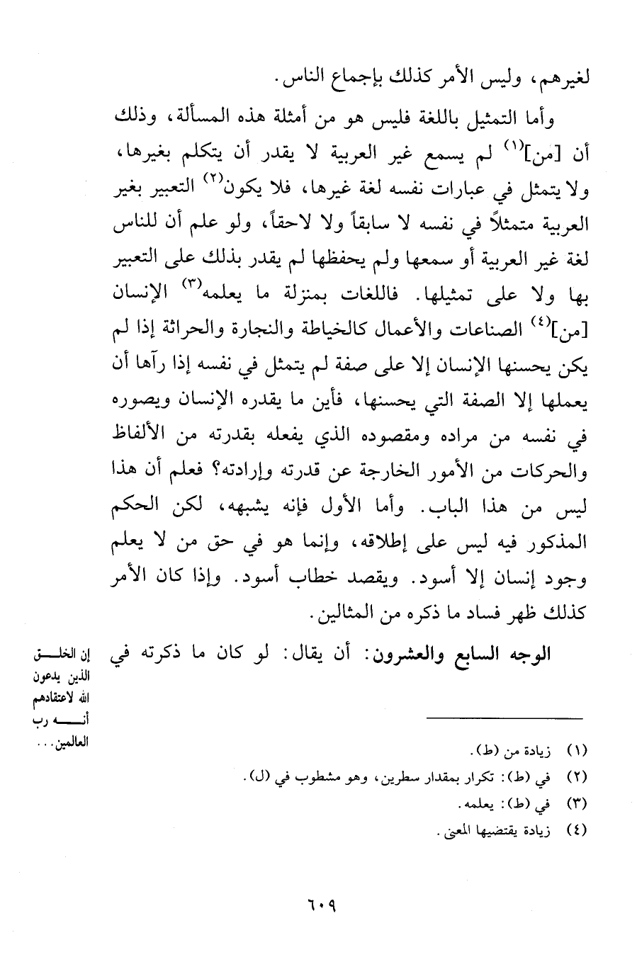 لغيرهم وليس الأمر كذلك بإجماع الناس وأما التمثيل باللغة فليس هو من أمثلة هذه المسالة وذلك أن من لم يسمع غير العربية لا يقدر أن يتكلم بغيرها ولا يتمثل في عبارات نفسه لغة غيرها فلا يكون التعبير بغير العربية متمثلاً في نفسه لا سابقاً ولا لاحقاً ولو علم أن للناس لغة غير العربية أو سمعها ولم يحفظها لم يقدر بذلك على التعبير بها ولا على تمثيلها فاللغات بمنزلة ما يعلمه الإنسان من الصناعات والأعمال كالخياطة والنجارة والحراثة إذا لم يكن يحسنها الإنسان إلا على صفة لم يتمثل في نفسه إذا رآها أن يعلمها إلا الصفة التي يحسنها فأين ما يقدره الإنسان ويصوره في نفسه من مراده ومقصوده الذي يفعله بقدرته من الألفاظ والحركات من الأمور الخارجة عن قدرته وإرادته فعلم أن هذا ليس من هذا الباب وأما الأول فإنه يشبهه لكن الحكم المذكور فيه ليس على إطلاقه وإنما هو في حق من لا يعلم وجود إنسان إلا أسود ويقصد خطاب اسود وإذا كان الأمر كذلك ظهر فساد ما ذكره من المثالين الوجه السابع والعشرون أن يقال لو كان ما ذكرته في