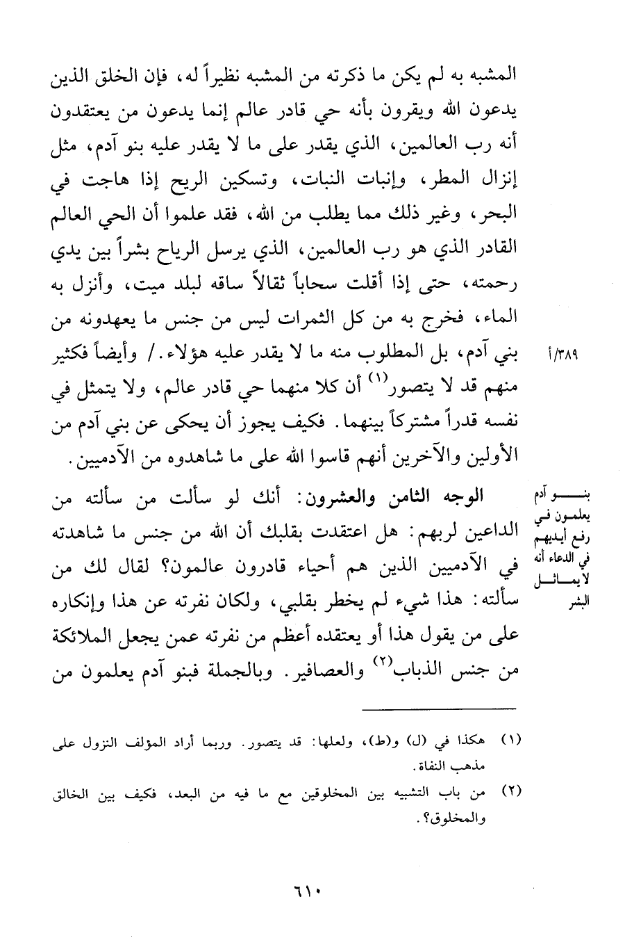 المشبه به لم يكن ما ذكرته من المشبه نظيراً له فإن الخلق الذين يدعون الله ويقرون بأنه حي قادر عالم إنما يدعون من يعتقدون أنه رب العالمين الذي يقدر على ما لا يقدر عليه بنو آدم مثل إنزال المطر وإنبات النبات وتسكين الريح إذا هاجت في البحر وغير ذلك مما يطلب من الله فقد علموا أن الحي العالم القادر الذي هو رب العالمين الذي هو يرسل الرياح بشراً بين يدي رحمته حتى إذا أقلت سحاباً ثقيلاً ساقه لبلد ميت وأنزل به الماء فخرج به من كل الثمرات ليس من جنس ما يعهدونه من بني آدم بل المطلوب منه ما لا يقدر عليه هؤلاء وأيضاً فكثير منهم قد لا يتصور أن كلا منهما حي قادر عالم ولا يتمثل في نفسه قدراً مشتركاً بينهما فكيف يجوز أن يحكي عن بني آدم من الأولين والآخرين أنهم قاسوا الله على ما شاهدوه من الآدميين الوجه الثامن والعشرون أنك لو سألت من سألته من الداعين لربهم هل اعتقدت بقلبك أن الله من جنس ما شاهدته في الآدميين الذين هم أحياء قادرون عالمون لقال لك من سألته هذا شيء لم يخطر بقلبي ولكان نفرته عن هذا وإنكاره على من يقول هذا أو يعتقده أعظم من نفرته عمن يجعل الملائكة من جنس الذباب والعصافير وبالجملة فبنو آدم يعلمون من