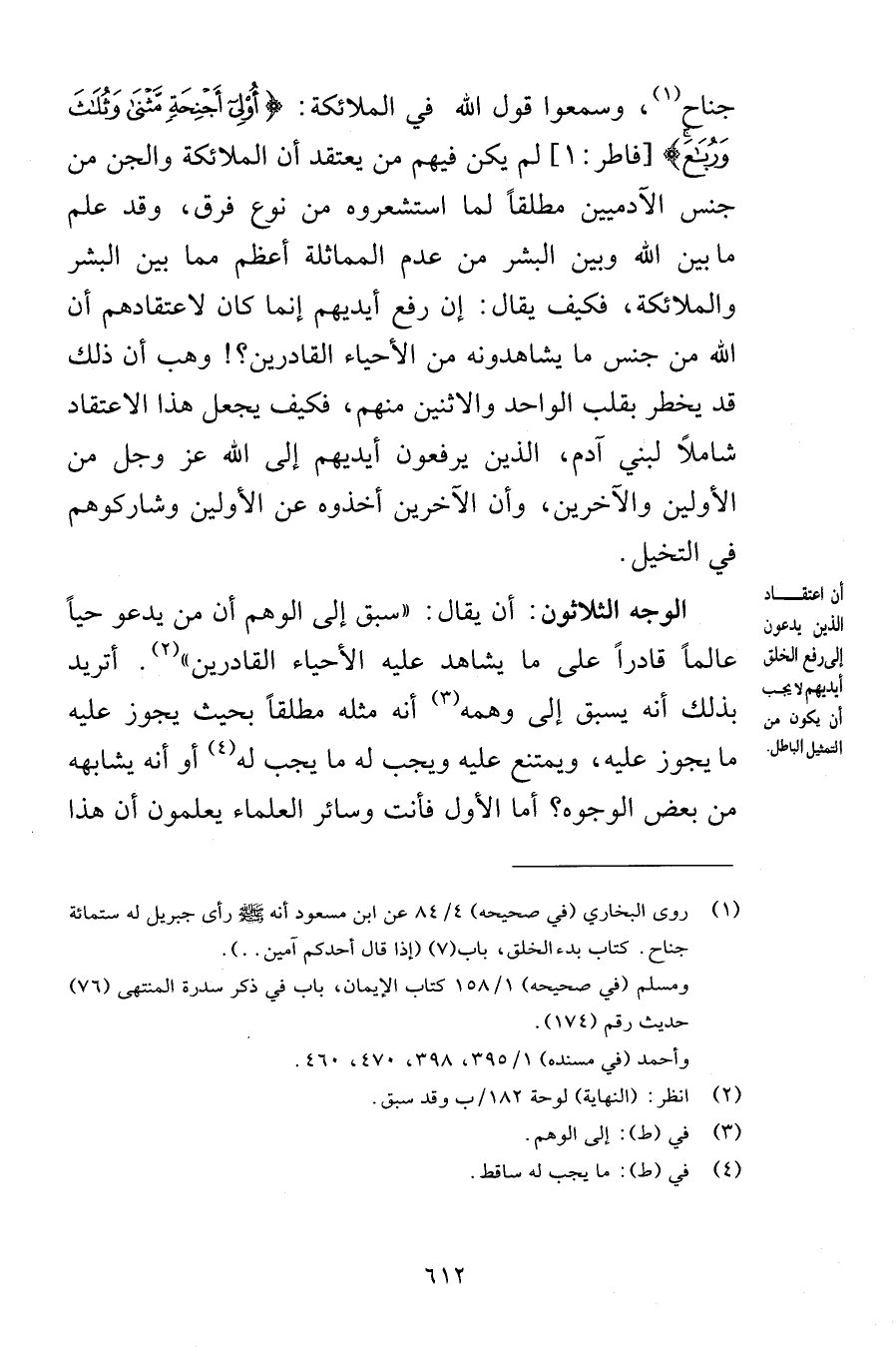 جناح وسمعوا قول الله في الملائكة أُولِي أَجْنِحَةٍ مَّثْنَى وَثُلَاثَ وَرُبَاعَ [فاطر 1] لم يكن فيهم من يعتقد أن الملائكة والجن من جنس الآدميين مطلقاً لما استشعروه من نوع فرق وقد علم ما بين الله وبين البشر من عدم المماثلة أعظم مما بين البشر والملائكة فكيف يقال إن رفع أيديهم إنما كان لاعتقادهم أن الله من جنس ما يشاهدونه من الأحياء القادرين وهب أن ذلك قد يخطر بقلب الواحد والاثنين منهم فكيف يجعل هذا الاعتقاد شاملاً لبني آدم الذين يرفعون أيديهم إلى الله عز وجل من الأولين والآخرين وأن الآخرين أخذوه عن الأولين وشاركوهم في التخيل الوجه الثلاثون أن يقال سبق إلى الوهم أن من يدعو حياً عالماً قادراً على ما يشاهد عليه الأحياء القادرين أتريد بذلك أنه يسبق إلى وهمه أنه مثله مطلقاً بحيث يجوز عليه ما يجوز عليه ويمتنع عليه ويجب له ما يجب له أو أنه يشابهه من بعض الوجوه أما الأول فأنت وسائر العلماء يعلمون أن هذا