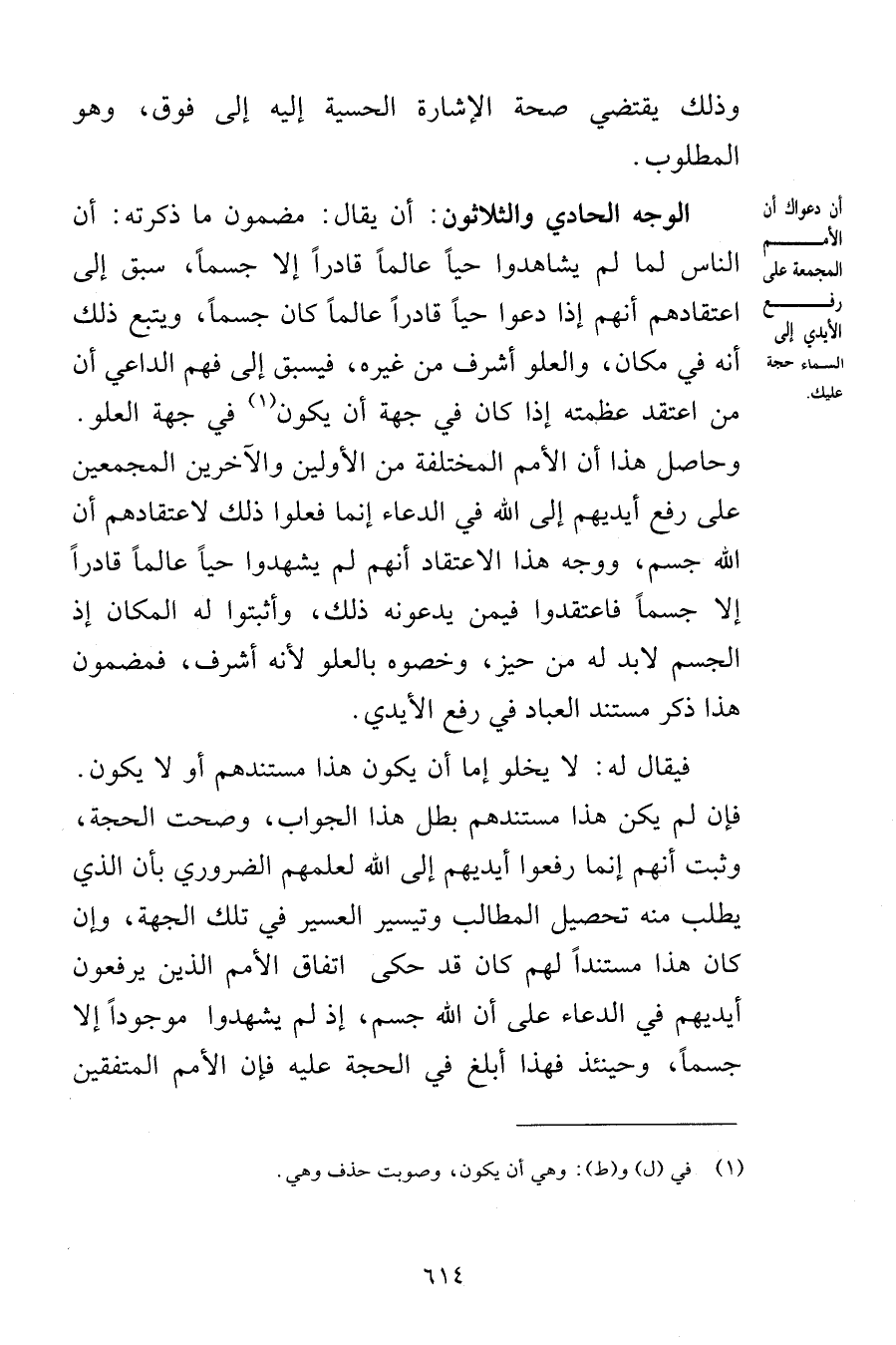 وذلك يقتضي صحة الإشارة الحسية إليه إلى فوق وهو المطلوب الوجه الحادي والثلاثون أن يقال مضمون ما ذكرته أن الناس لما لم يشاهدوا حياً عالماً قادراً إلا جسماً سبق إلى اعتقادهم أنهم إذا دعوا حياً قادراً عالماً كان جسماً ويتبع ذلك أنه في مكان والعلو اشرف من غيره فيسبق إلى فهم الداعي أن من اعتقد عظمته إذا كان في جهة أن يكون في جهة العلو وحاصل هذا أن المم المختلفة من الأولين والآخرين المجمعين على رفع أيديهم إلى الله في الدعاء إنما فعلوا ذلك لاعتقادهم أن الله جسم ووجه هذا الاعتقاد أنهم لم يشهدوا حياً عالماً قادراً إلا جسماً فاعتقدوا فيمن يدعونه ذلك وأثبتوا له المكان إذ الجسم لابد له من حيز وخصوه بالعلو لأنه أشرف فمضمون هذا ذكر مستند العباد في رفع الأيدي فيقال له لا يخلو إما أن يكون هذا مستندهم أو لا يكون فإن لم يكن هذا مستندهم بطل هذا الجواب وصحة الحجة وثبت أنهم إنما رفعوا أيديهم إلى الله لعلمهم الضروري بان الذي يطلب منه تحصيل المطالب وتيسير العسير في تلك الجهة وإن كان هذا مستنداً لهم كان قد حكى اتفاق الأمم الذين يرفعون أيديهم في الدعاء على أن الله جسم إذ لم يشهدوا موجوداً إلا جسماً وحينئذ فهذا أبلغ في الحجة عليه فإن الأمم المتفقين