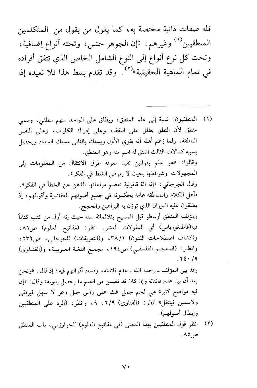 فله صفات ذاتية مختصة به كما يقول من يقول من المتكلمين المنطقيين وغيرهم إن الجوهر جنس وتحته أنواع إضافية وتحت كل نوع أنواع إلى النوع الشامل الخاص الذي تتفق أفراده في تمام الماهية الحقيقية وقد تقدم بسط هذا فلا نعيده إذا