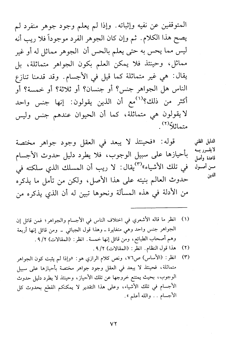 المتوقفين عن نفيه وإثباته وإذا لم يعلم وجود جوهر منفرد لم يصح هذا الكلام ثم وإن كان الجوهر الفرد موجوداً فلا ريب أنه ليس مما يحس به حتى يعلم بالحس أن الجوهر مماثل له أو غير مماثل وحينئذ فلا يمكن العلم بكون الجواهر متماثلة بل يقال هي غير متماثلة كما قيل في الأجسام وقد قدمنا تنازع الناس هل الجواهر جنس أو جنسان أو ثلاثة أو خمسة أو أكثر من ذلك مع أن الذين يقولون إنها جنس واحد لا يقولون هي متماثلة كما أن الحيوان عندهم جنس وليس متماثلاً قوله فحينئذ لا يبعد في العقل وجود جواهر مختصة بأحيازها على سبيل الوجوب فلا يطرد دليل حدوث الأجسام في تلك الأشياء يقال لا ريب أن المسلك الذي سلكته في حدوث العالم بنيته على هذا الأصل ولكن تأمل ما يذكره من الأدلة في هذه المسألة ونحوها تبين له أن الذي يذكره من