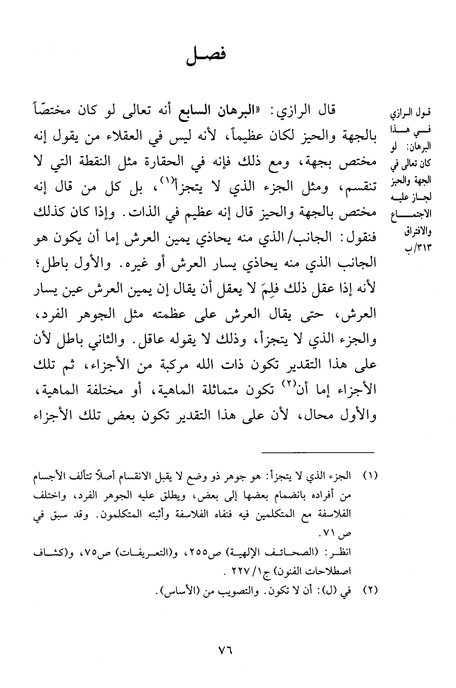 فصل قال الرازي البرهان السابع أنه تعالى لو كان مختصّاً بالجهة والحيز لكان عظيماً لأنه ليس في العقلاء من يقول إنه مختص بجهة ومع ذلك فإنه في الحقارة مثل النقطة التي لا تنقسم ومثل الجزء الذي لا يتجزأ بل كل من قال إنه مختص بالجهة والحيز قال إنه عظيم في الذات وإذا كان كذلك فنقول الجانب الذي منه يحاذي يمين العرش إما أن يكون هو الجانب الذي منه يحاذي يسار العرش أو غيره والأول باطل لأنه إذا عقل ذلك فلِمَ لا يعقل أن يقال إن يمين العرش عين يسار العرش حتى يقال العرش على عظمته مثل الجوهر الفرد والجزء الذي لا يتجزأ وذلك لا يقوله عاقل والثاني باطل لأن على هذا التقدير تكون ذات الله مركبة من الأجزاء ثم تلك الأجزاء إما أن تكون متماثلة الماهية أو مختلفة الماهية والأول محال لأن على هذا التقدير تكون بعض تلك الأجزاء