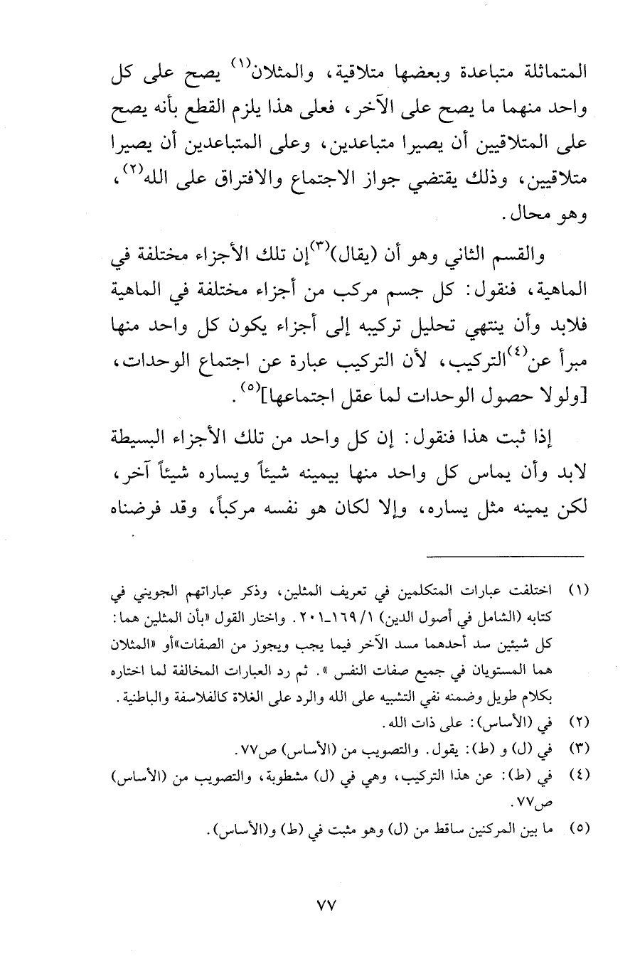 المتماثلة متباعدة وبعضها متلاقية والمثلان يصح على كل واحد منهما ما يصح على الآخر فعلى هذا يلزم القطع بأنه يصح على المتلاقيين أن يصيرا متباعدين وعلى المتباعدين أن يصيرا متلاقيين وذلك يقتضي جواز الاجتماع والافتراق على الله وهو محال والقسم الثاني وهو أن يقال إن تلك الأجزاء مختلفة في الماهية فنقول كل جسم مركب من أجزاء مختلفة في الماهية فلابد وأن ينتهي تحليل تركيبه إلى أجزاء يكون كل واحد منها مبرأ عن التركيب لأن التركيب عبارة عن اجتماع الوحدات ولولا حصول الوحدات لما عقل اجتماعهما إذا ثبت هذا فنقول إن كل واحد من تلك الأجزاء البسيطة لابد وأن يماس كل واحد منها بيمينه شيئاً ويساره شيئاً آخر لكن يمينه مثل يساره وإلا لكان هو نفسه مركباً وقد فرضناه