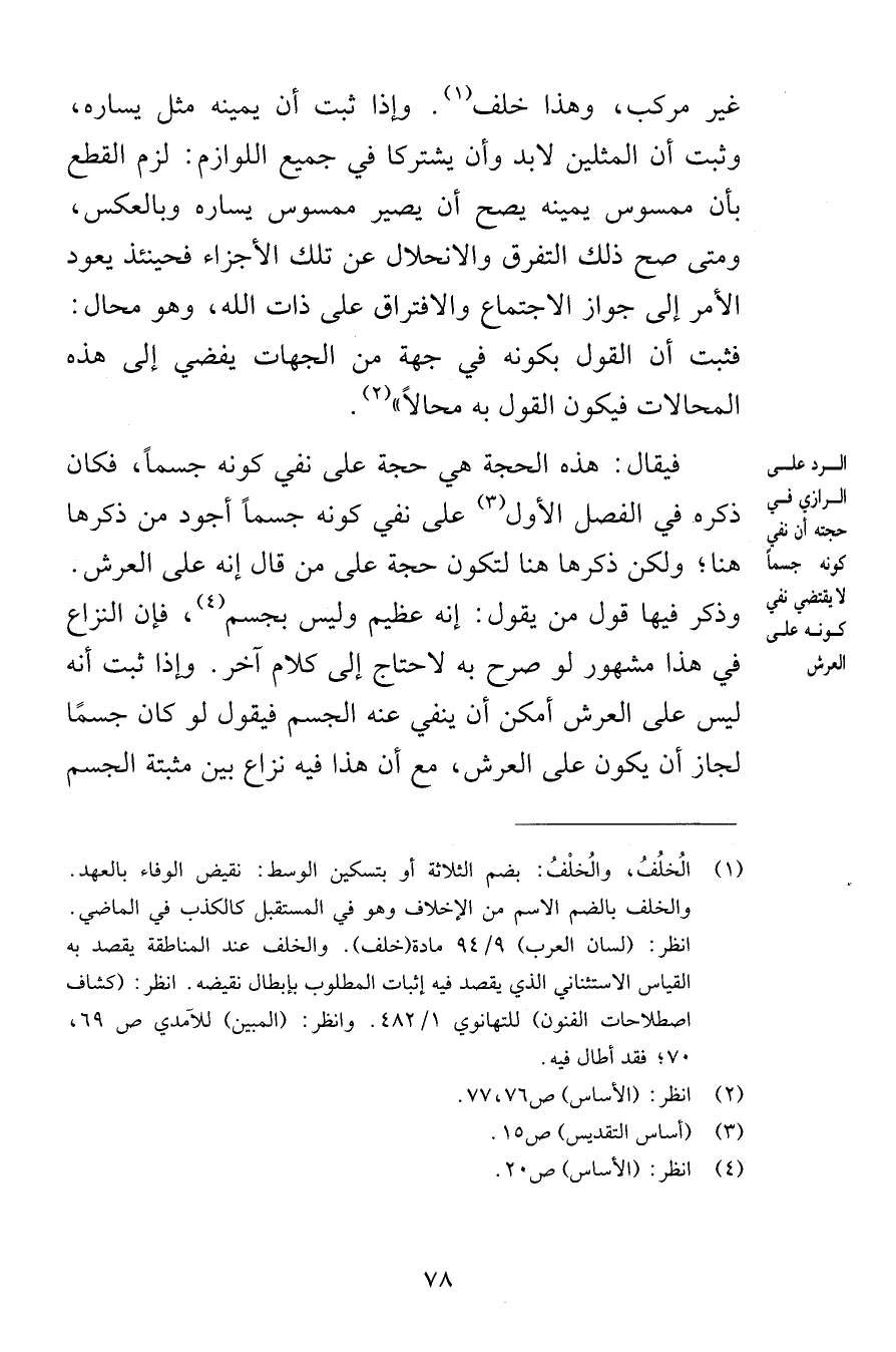 غير مركب وهذا خلف وإذا ثبت أن يمينه مثل يساره وثبت أن المثلين لابد وأن يشتركا في جميع اللوازم لزم القطع بأن ممسوس يمينه يصح أن يصير ممسوس يساره وبالعكس ومتى صح ذلك التفرق والانحلال عن تلك الأجزاء فحينئذ يعود الأمر إلى جواز الاجتماع والافتراق على ذات الله وهو محال فثبت أن القول بكونه في جهة من الجهات يفضي إلى هذه المحالات فيكون القول به محالاً فيقال هذه الحجة هي حجة على نفي كونه جسماً فكان ذكره في الفصل الأول على نفي كونه جسماً أجود من ذكرها هنا ولكن ذكرها هنا لتكون حجة على من قال إنه على العرش وذكر فيها قول من يقول إنه عظيم وليس بجسم فإن النزاع في هذا مشهور لو صرح به لاحتاج إلى كلام آخر وإذا ثبت أنه ليس على العرش أمكن أن ينفي عنه الجسم فيقول لو كان جسمًا لجاز أن يكون على العرش مع أن هذا فيه نزاع بين مثبتة الجسم