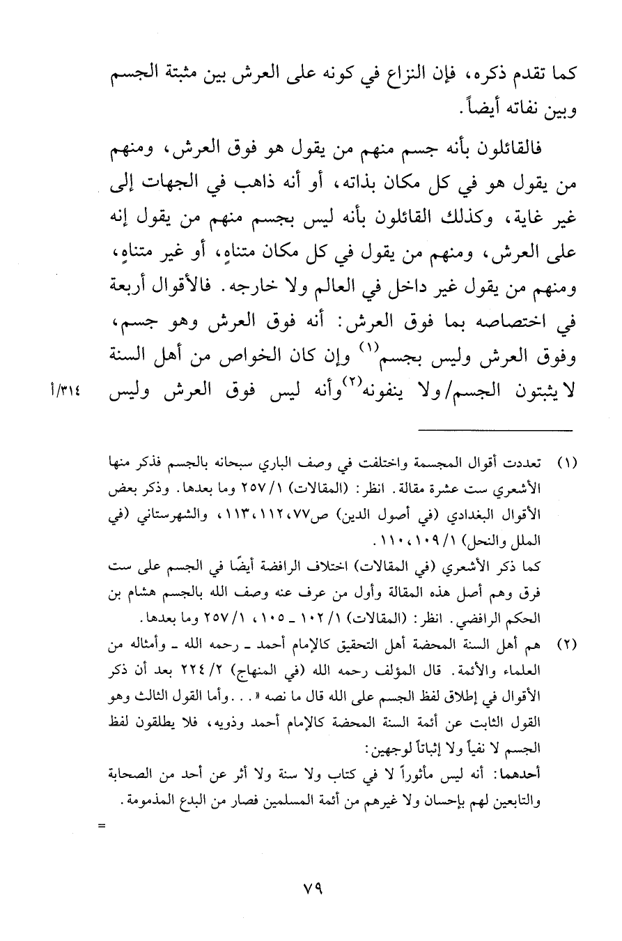 كما تقدم ذكره فإن النزاع في كونه على العرش بين مثبتة الجسم وبين نفاته أيضاً فالقائلون بأنه جسم منهم من يقول هو فوق العرش ومنهم من يقول هو في كل مكان بذاته أو أنه ذاهب في الجهات إلى غير غاية وكذلك القائلون بأنه ليس بجسم منهم من يقول إنه على العرش ومنهم من يقول في كل مكان متناهٍ أو غير متناهٍ ومنهم من يقول غير داخل في العالم ولا خارجه فالأقوال أربعة في اختصاصه بما فوق العرش أنه فوق العرش وهو جسم وفوق العرش وليس بجسم وإن كان الخواص من أهل السنة لا يثبتون الجسم ولا ينفونه وأنه ليس فوق العرش وليس