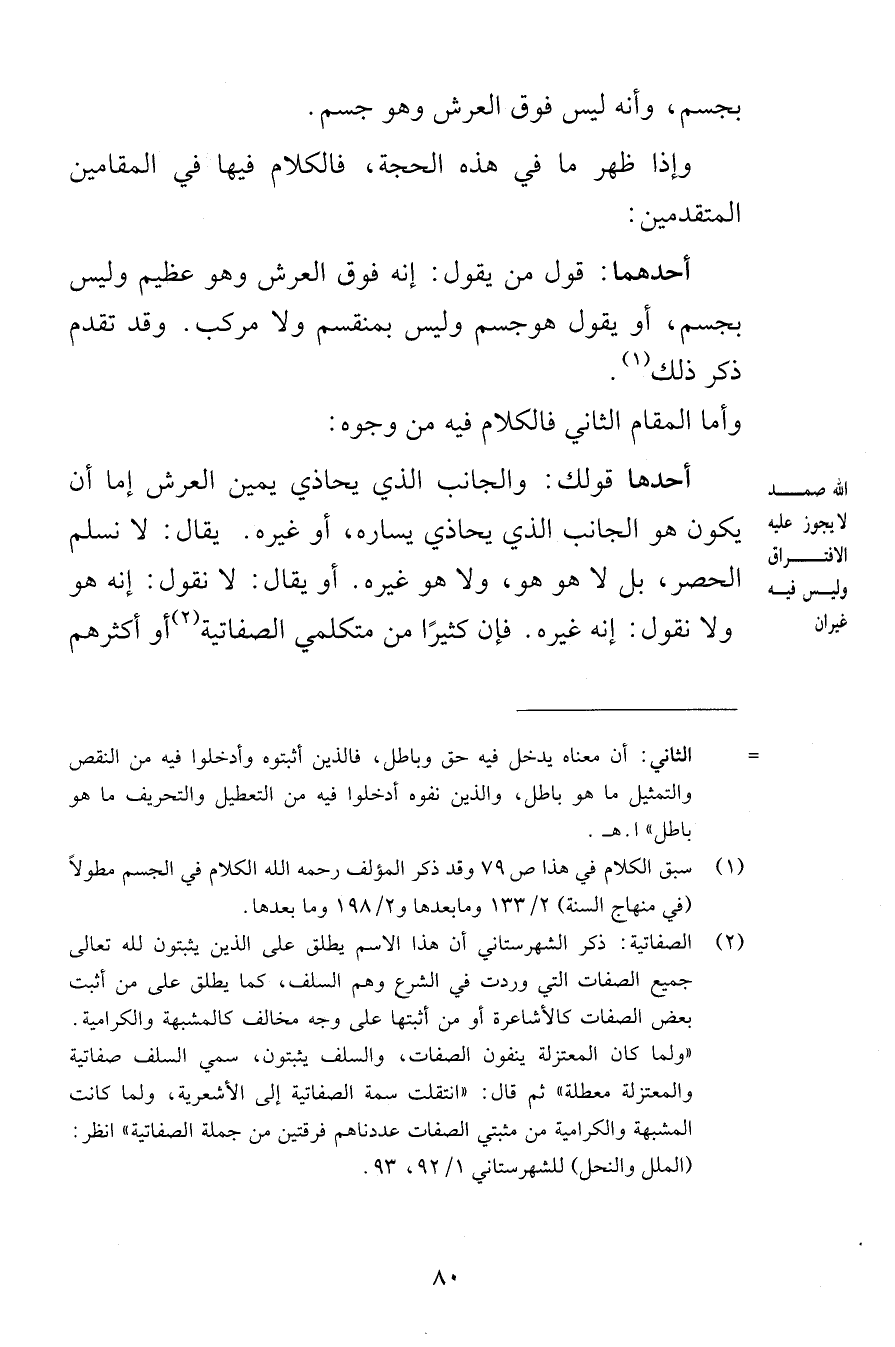 بجسم وأنه ليس فوق العرش وهو جسم وإذا ظهر ما في هذه الحجة فالكلام فيها في المقامين المتقدمين أحدهما قول من يقول إنه فوق العرش وهو عظيم وليس بجسم أو يقول هوجسم وليس بمنقسم ولا مركب وقد تقدم ذكر ذلك وأما المقام الثاني فالكلام فيه من وجوه أحدها قولك والجانب الذي يحاذي يمين العرش إما أن يكون هو الجانب الذي يحاذي يساره أو غيره يقال لا نسلم الحصر بلا لا هو هو ولا هو غيره أو يقال لا نقول إنه هو ولا نقول إنه غيره فإن كثيرًا من متكلمي الصفاتية أو أكثرهم