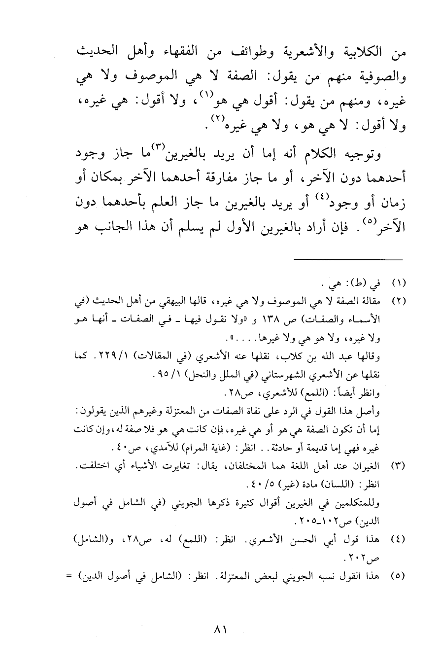 من الكلابية والأشعرية وطوائف من الفقهاء وأهل الحديث والصوفية منهم من يقول أقول هي هو ولا أقول هي غيره ولا أقول لا هي هو ولا هي غيره وتوجيه الكلام أنه إما أن يريد بالغيرين ما جاز وجود أحدهما دون الآخر أو ما جاز مفارقة أحدهما الآخر بمكان أو زمان أو وجود أو يريد بالغيرين ما جاز العلم بأحدهما دون الآخر فإن أراد بالغيرين الأول لم يسلم أن هذا الجانب هو