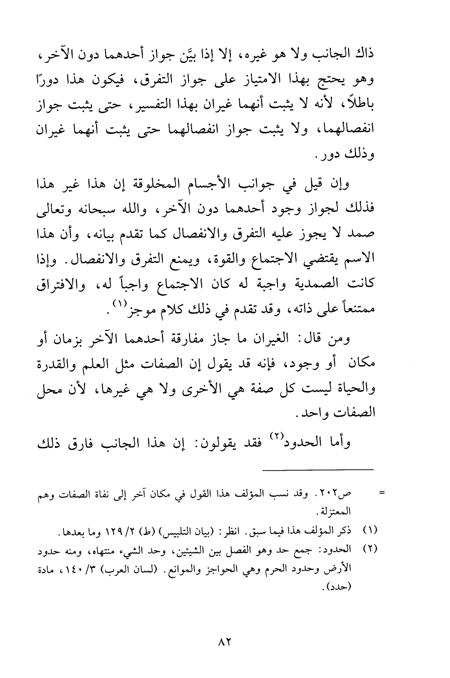 ذاك الجانب ولا هو غيره إلا إذا بيَّن جواز أحدهما دون الآخر وهو يحتج بهذا الامتياز على جواز التفرق فيكون هذا دورًا باطلاً لأنه لا يثبت أنهما غيران بهذا التفسير حتى يثبت جواز انفصالهما ولا يثبت جواز انفصالهما حتى يثبت أنهما غيران وذلك دور وإن قيل في جوانب الأجسام المخلوقة إن هذا غير هذا فذلك لجواز وجود أحدهما دون الآخر والله سبحانه وتعالى صمد لا يجوز عليه التفرق والانفصال كما تقدم بيانه وأن هذا الاسم يقتضي الاجتماع والقوة ويمنع التفرق والانفصال وإذا كانت الصمدية واجبة له كان الاجتماع واجباً له والافتراق ممتنعاً على ذاته وقد تقدم في ذلك كلام موجز ومن قال الغيران ما جاز مفارقة أحدهما الآخر بزمان أو مكان أو وجود فإنه قد يقول إن الصفات مثل العلم والقدرة والحياة ليست كل صفة هي الأخرى ولا هي غيرها لأن محل الصفات واحد وأما الحدود فقد يقولون إن هذا الجانب فارق ذلك