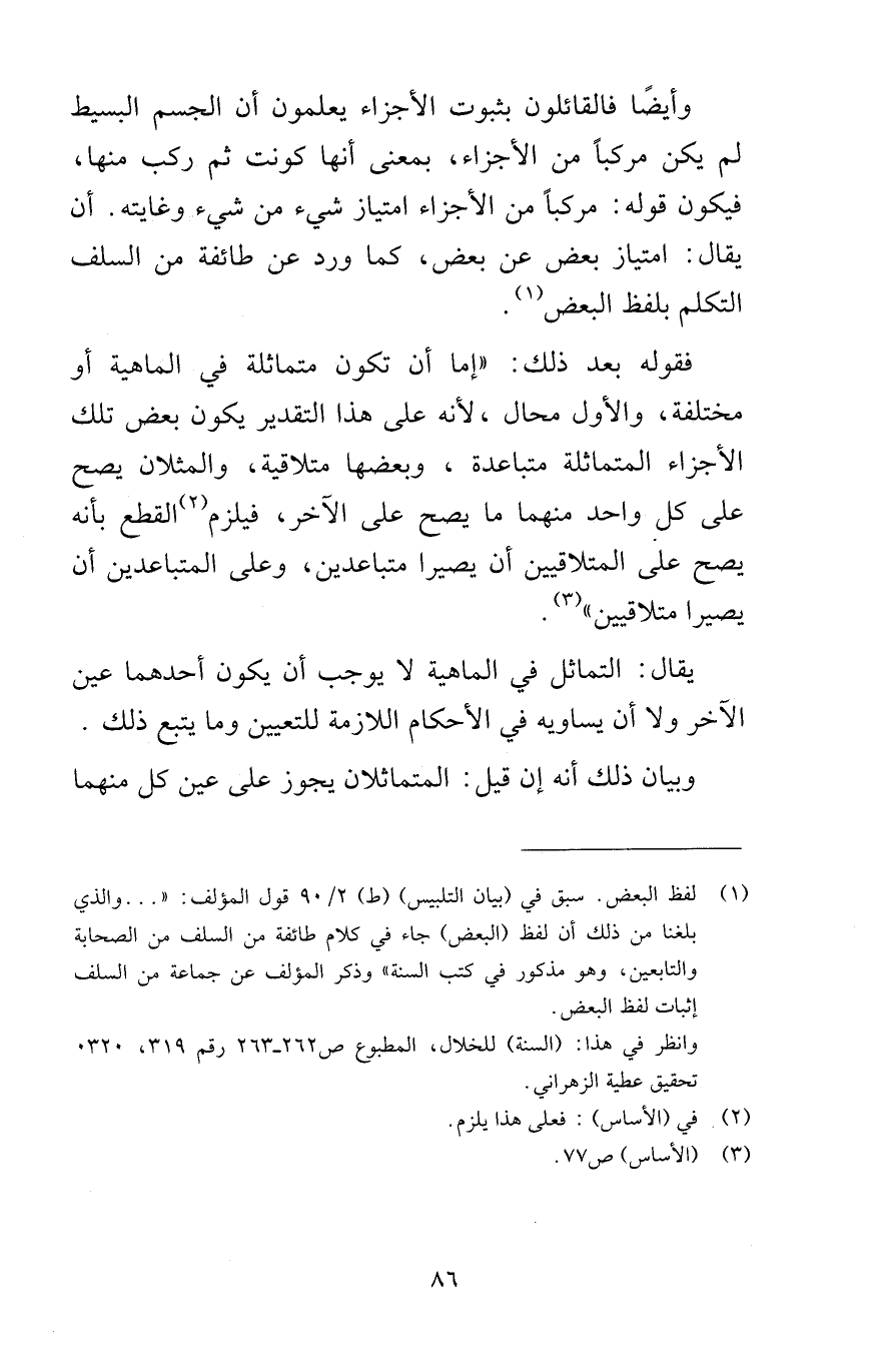 وأيضًا فالقائلون بثبوت الأجزاء يعلمون أن الجسم البسيط لم يكن مركباً من الأجزاء بمعنى أنها كونت ثم ركب منها فيكون قوله مركباً من الأجزاء امتياز شيء من شيء وغايته أن يقال امتياز بعض عن بعض كما ورد عن طائفة من السلف التكلم بلفظ البعض فقوله بعد ذلك إما أن تكون متماثلة في الماهية أو مختلفة والأول محال لأنه على هذا التقدير يكون بعض تلك الأجزاء المتماثلة متباعدة وبعضها متلاقية والمثلان يصح على كل واحد منهما ما يصح على الآخر فيلزم القطع بأنه يصح على المتلاقيين أن يصيرا متباعدين وعلى المتباعدين أن يصيرا متلاقيين يقال التماثل في الماهية لا يوجب أن يكون أحدهما عين الآخر ولا أن يساويه في الأحكام اللازمة للتعيين وما يتبع ذلك وبيان ذلك أنه إن قيل المتماثلان يجوز على عين كل منهما