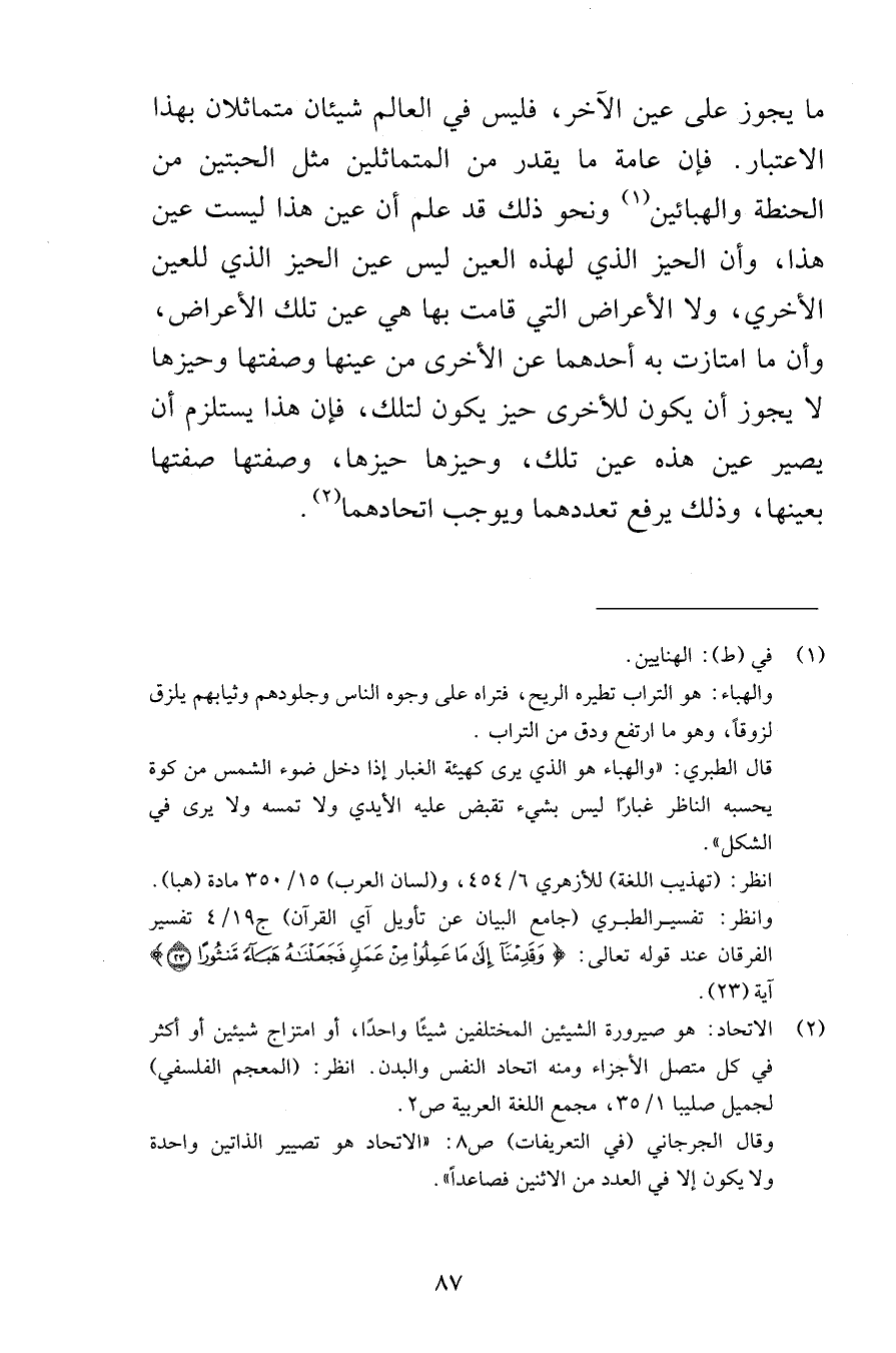 ما يجوز على عين الآخر فليس في العالم شيئان متماثلان بهذا الاعتبار فإن عامة ما يقدر من المتماثلين مثل الحبتين من الحنطة والهبائين ونحو ذلك قد علم أن عين هذا ليست عين هذا وأن الحيز الذي لهذه العين ليس عين الحيز الذي للعين الأخرى ولا الأعراض التي قامت بها هي عين تلك الأعراض وأن ما امتازت به أحدهما عن الأخرى من عينها وصفتها وحيزها لا يجوز أن يكون للأخرى حيز يكون لتلك فإن هذا يستلزم أن يصير عين هذه عين تلك وحيزها حيزها وصفتها صفتها بعينها وذلك يرفع تعددهما ويوجب اتحادهما