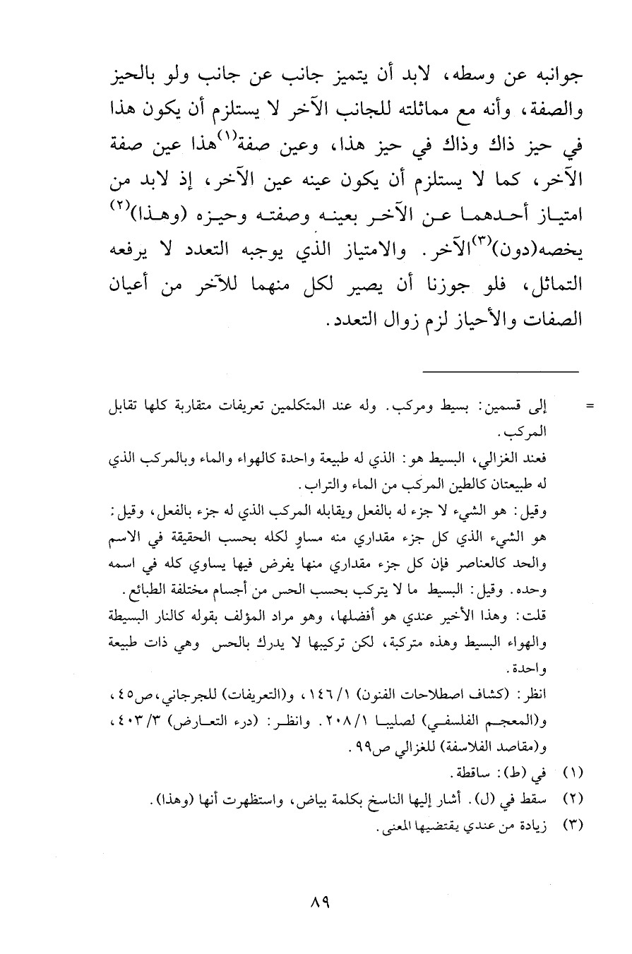 جوانبه عن وسطه لابد أن يتميز جانب عن جانب ولو بالحيز والصفة وأنه مع مماثلته للجانب الآخر لا يستلزم أن يكون هذا في حيز ذاك وذاك في حيز هذا وعين صفة هذا عين صفة الآخر كما لا يستلزم أن يكون عينه عين الآخر إذ لابد من امتياز أحدهما عن الآخر بعينه وصفته وحيزه وهذا يخصه دون الآخر والامتياز الذي يوجبه التعدد لا يرفعه التماثل فلو جوزنا أن يصير لكل منهما للآخر من أعيان الصفات والأحياز لزم زوال التعدد