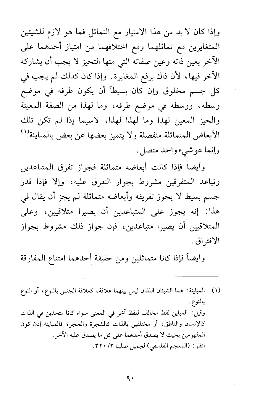 وإذا كان لا بد من هذا الامتياز مع التماثل فما هو لازم للشيئين المتغايرين مع تماثلهما ومع اختلافهما من امتياز أحدهما على الآخر بعين ذاته وعين صفاته التي منها التحيز لا يجب أن يشاركه الآخر فيها لأن ذاك يرفع المغايرة وإذا كان كذلك لم يجب في كل جسم مخلوق وإن كان بسيطاً أن يكون طرفه في موضع وسطه ووسطه في موضع طرفه وما لهذا من الصفة المعينة والحيز المعين لهذا وما لهذا لهذا لاسيما إذا لم تكن تلك الأبعاض المتماثلة منفصلة ولا يتميز بعضها عن بعض بالمباينة وإنما هوشيء واحد متصل وأيضا فإذا كانت أبعاضه متماثلة فجواز تفرق المتباعدين وتباعد المتفرقين مشروط بجواز التفرق عليه وإلا فإذا قدر جسم بسيط لا يجوز تفريقه وأبعاضه متماثلة لم يجز أن يقال في هذا إنه يجوز على المتباعدين أن يصيرا متلاقيين وعلى المتلاقيين أن يصيرا متباعدين فإن جواز ذلك مشروط بجواز الافتراق وأيضاً فإذا كانا متماثلين ومن حقيقة أحدهما امتناع المفارقة