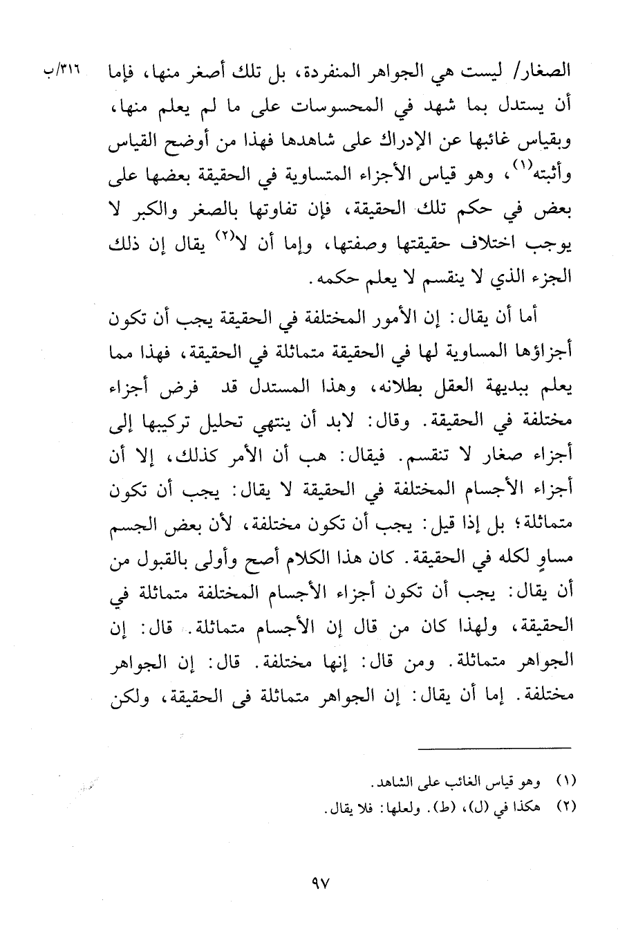 الصغار ليست هي الجواهر المنفردة بل تلك أصغر منها فإما أن يستدل بما شهد في المحسوسات على ما لم يعلم منها وبقياس غائبها عن الإدراك على شاهدها فهذا من أوضح القياس وأثبته وهو قياس الأجزاء المتساوية في الحقيقة بعضها على بعض في حكم تلك الحقيقة فإن تفاوتها بالصغر والكبر لا يوجب اختلاف حقيقتها وصفتها وإما أن لا يقال إن ذلك الجزء الذي لا ينقسم لا يعلم حكمه أما أن يقال إن الأمور المختلفة في الحقيقة يجب أن تكون أجزاؤها المساوية لها في الحقيقة متماثلة في الحقيقة فهذا مما يعلم ببديهة العقل بطلانه وهذا المستدل قد فرض أجزاء مختلفة في الحقيقة وقال لابد أن ينتهي تحليل تركيبها إلى أجزاء صغار لا تنقسم فيقال هب أن الأمر كذلك إلا أن أجزاء الأجسام المختلفة في الحقيقة لا يقال يجب أن تكون متماثلة بل إذا قيل يجب أن تكون مختلفة لأن بعض الجسم مساوٍ لكله في الحقيقة كان هذا الكلام أصح وأولى بالقبول من أن يقال يجب أن تكون أجزاء الأجسام المختلفة متماثلة في الحقيقة ولهذا كان من قال إن الأجسام متماثلة قال إن الجواهر متماثلة ومن قال إنها مختلفة قال إن الجواهر مختلفة إما أن يقال إن الجواهر متماثلة في الحقيقة ولكن