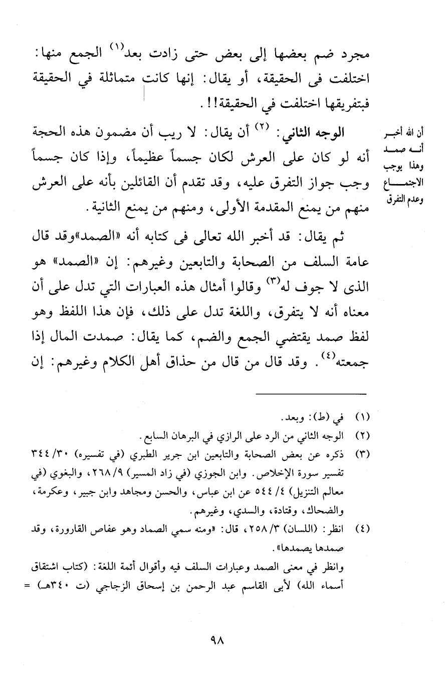مجرد ضم بعضها إلى بعض حتى زادت بعد الجمع منها اختلفت في الحقيقة أو يقال إنها كانت متماثلة في الحقيقة فبتفريقها اختلفت في الحقيقة الوجه الثاني أن يقال لا ريب أن مضمون هذه الحجة أنه لو كان على العرش لكان جسماً عظيماً وإذا كان جسماً وجب جواز التفرق عليه وقد تقدم أن القائلين بأنه على العرش منهم من يمنع المقدمة الأولى ومنهم من يمنع الثانية ثم يقال قد أخبر الله تعالى في كتابه أنه الصمد وقد قال عامة السلف من الصحابة والتابعين وغيرهم إن الصمد هو الذي لا جوف له وقالوا أمثال هذه العبارات التي تدل على أن معناه أنه لا يتفرق واللغة تدل على ذلك فإن هذا اللفظ وهو لفظ الصمد يقتضي الجمع والضم كما يقال صمدت المال إذا جمعته وقد قال من قال من حذاق أهل الكلام وغيرهم إن