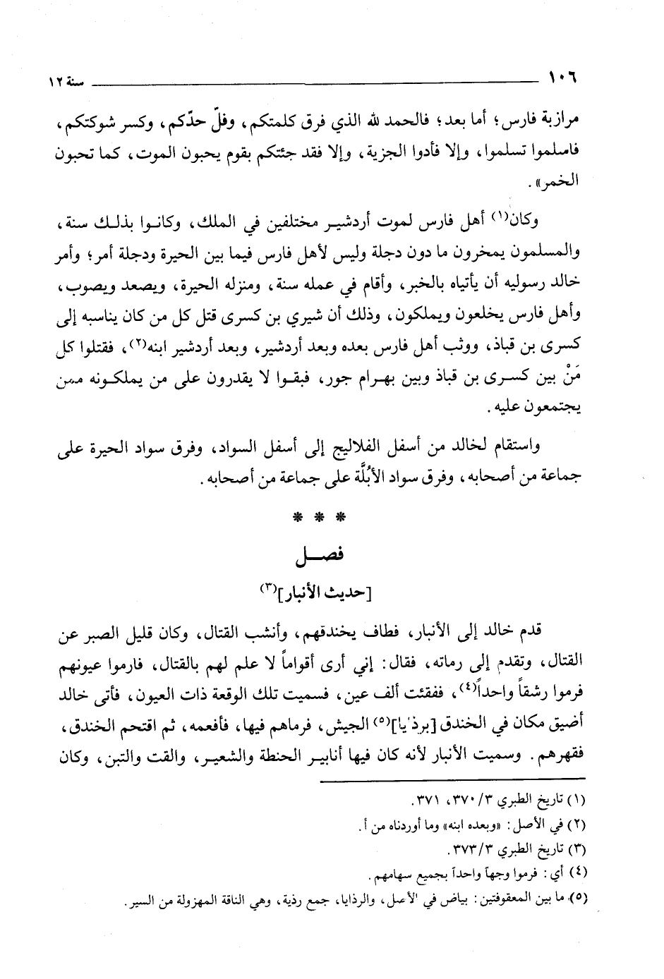 قدم خالد إلى الأنبار، فطاف يخندقهم، وأنشب القتال، وكان قليل الصبر عَن القتال، وتقدم إلى رماته، فقال: إني أرى أقواما لا علم لهم بالقتال، فارموا عيونهم فرموا رشقا واحدًا [4] ، ففقئت ألف عين، فسميت تلك الوقعة ذات العيون، فأتى خالد أضيق مكان في الخندق [برذايا] [5] الجيش، فرماهم فيها، فأفعمه، ثم اقتحم الخندق، فقهرهم. وسميت الأنبار لأنه كان فيها أنابير الحنطة والشعير، والقت والتبن، وكان