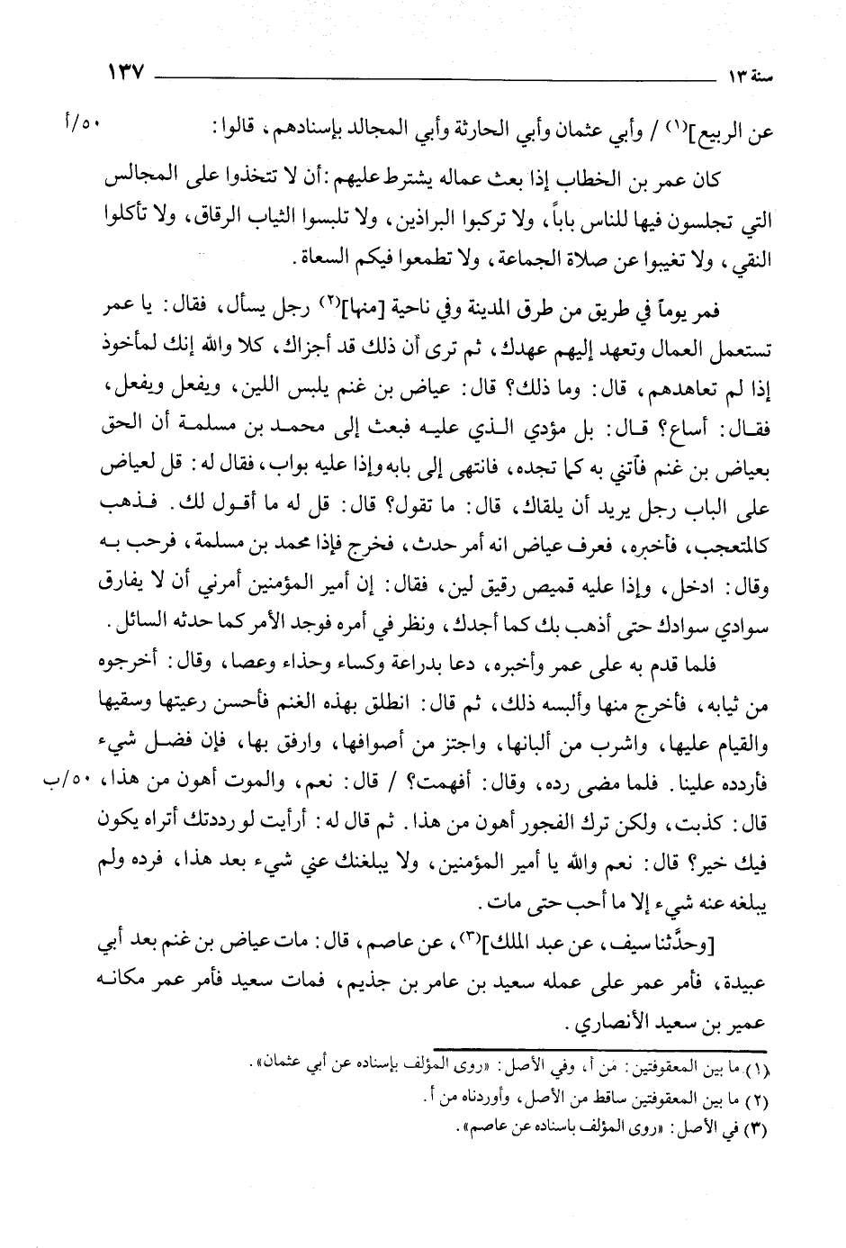 كَانَ عُمَرُ بْنُ الْخَطَّابِ إِذَا بَعَثَ عُمَّالَهُ يَشْتَرِطُ عَلَيْهِمِ: أَنْ لا تَتَّخِذُوا عَلَى الْمَجَالِسِ الَّتِي تَجْلِسُونَ فِيهَا لِلنَّاسِ بَابًا، وَلا تَرْكَبُوا الْبَرَاذِينَ، وَلا تَلْبَسُوا الثِّيَابَ الرِّقَاقَ، وَلا تَأْكُلُوا النَّقِيَّ، وَلا تَغِيبُوا عَنْ صَلاةِ الْجَمَاعَةِ، وَلا تُطْمِعُوا فِيكُمُ السُّعَاةَ.