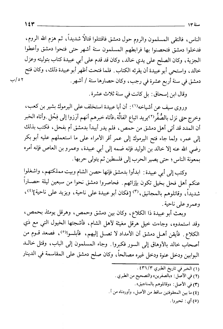 النّاس، فالتقى المسلمون والروم حول دمشق فاقتتلوا قتالا شديدا، ثم هزم الله الروم، فدخلوا دمشق فتحصنوا بها فرابطهم المسلمون ستة أشهر حتى فتحوا دمشق وأعطوا الجزية، وكان الصلح على يدي خالد، وكان قد قدم على أبي عبيدة كتاب بتوليته وعزل خالد، واستحى أَبُو عبيدة أن يقرئه الكتاب. فلما فتحت أظهر أبو عبيدة ذلك، وكان فتح دمشق في سنة أربع عشرة في رجب، وكان حصارها ستة/ أشهر.