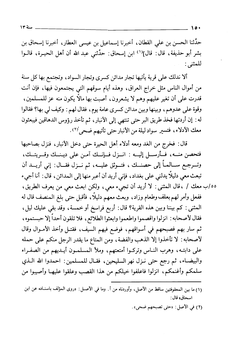 حَدَّثَنَا الْحَسَنُ بْنُ عَلِيٍّ الْقَطَّانُ، أَخْبَرَنَا إِسْمَاعِيلُ بْنُ عيسى العطار، أخبرنا إسحاق بن بشر أبو حذيفة، قال: قال] [1] ابن إسحاق: حدثني عبد الله أن أهل الحيرة، قالوا للمثنى: