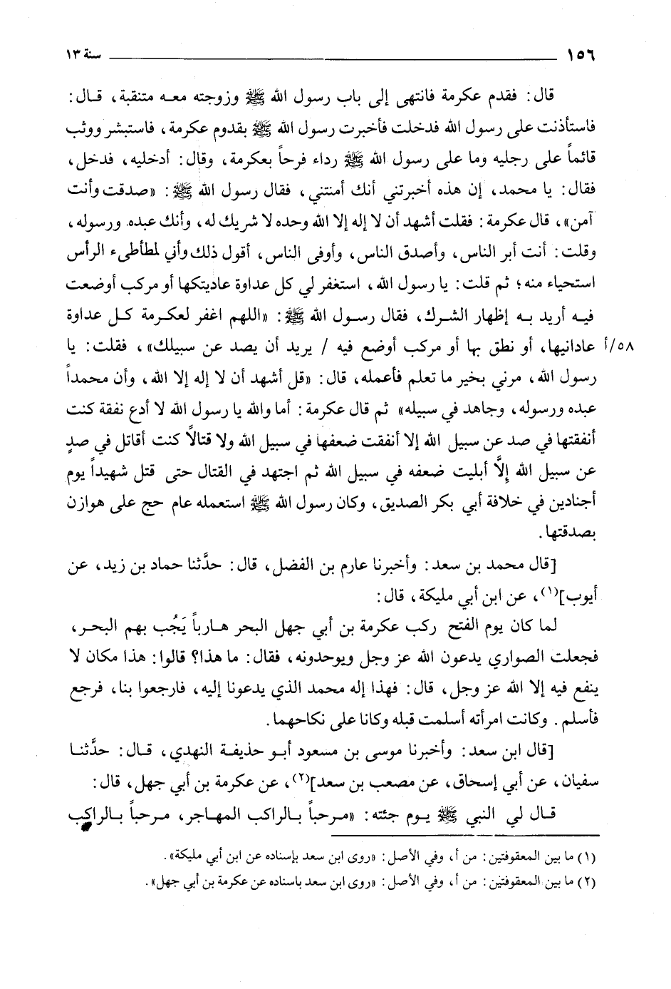 [2] ما بين المعقوفتين: من أ، وفي الأصل: «روى ابن سعد بإسناده عن عكرمة بن أبي جهل» .