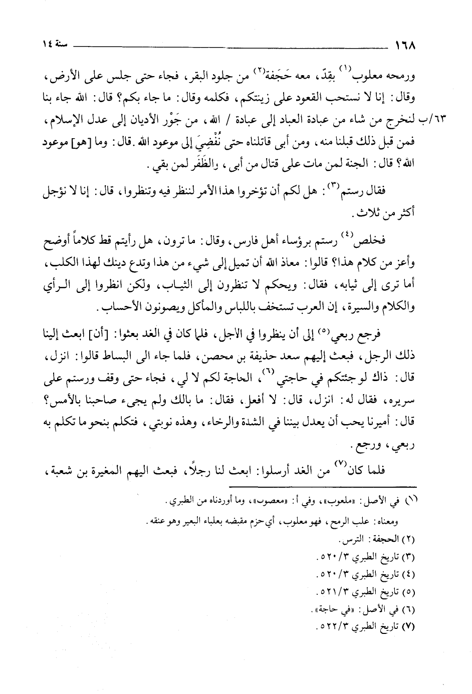 ورمحه معلوب [1] بقد، معه حجفة [2] من جلود البقر، فجاء حتى جلس على الأرض، وقال: إنا لا نستحب القعود على زينتكم، فكلمه وقال: ما جاء بكم؟ قال: الله جاء بنا لنخرج من شاء من عبادة العباد إلى عبادة/ الله، من جور الأديان إلى عدل الإسلام، فمن قبل ذلك قبلنا منه، ومن أبى قاتلناه حتى نفضي إلى موعود الله. قال: وما [هو] موعود الله؟ قال: الجنة لمن مات على قتال من أبى، والظفر لمن بقي.