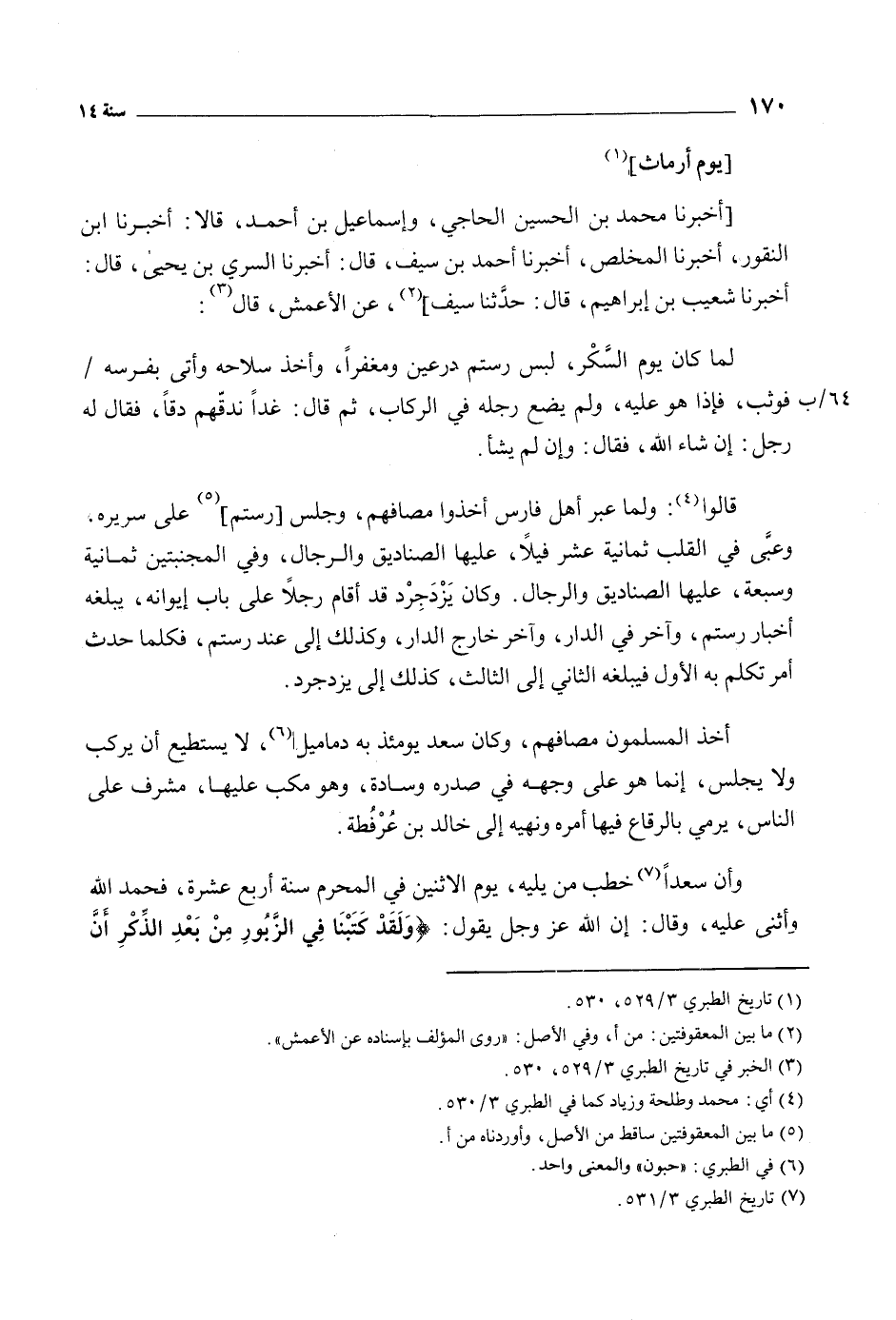 وأن سعدا [7] خطب من يليه، يوم الاثنين في المحرم سنة أربع عشرة، فحمد الله وأثنى عليه، وقال: إن الله عز وجل يقول: وَلَقَدْ كَتَبْنا فِي الزَّبُورِ مِنْ بَعْدِ الذِّكْرِ أَنَّ 21: 105
