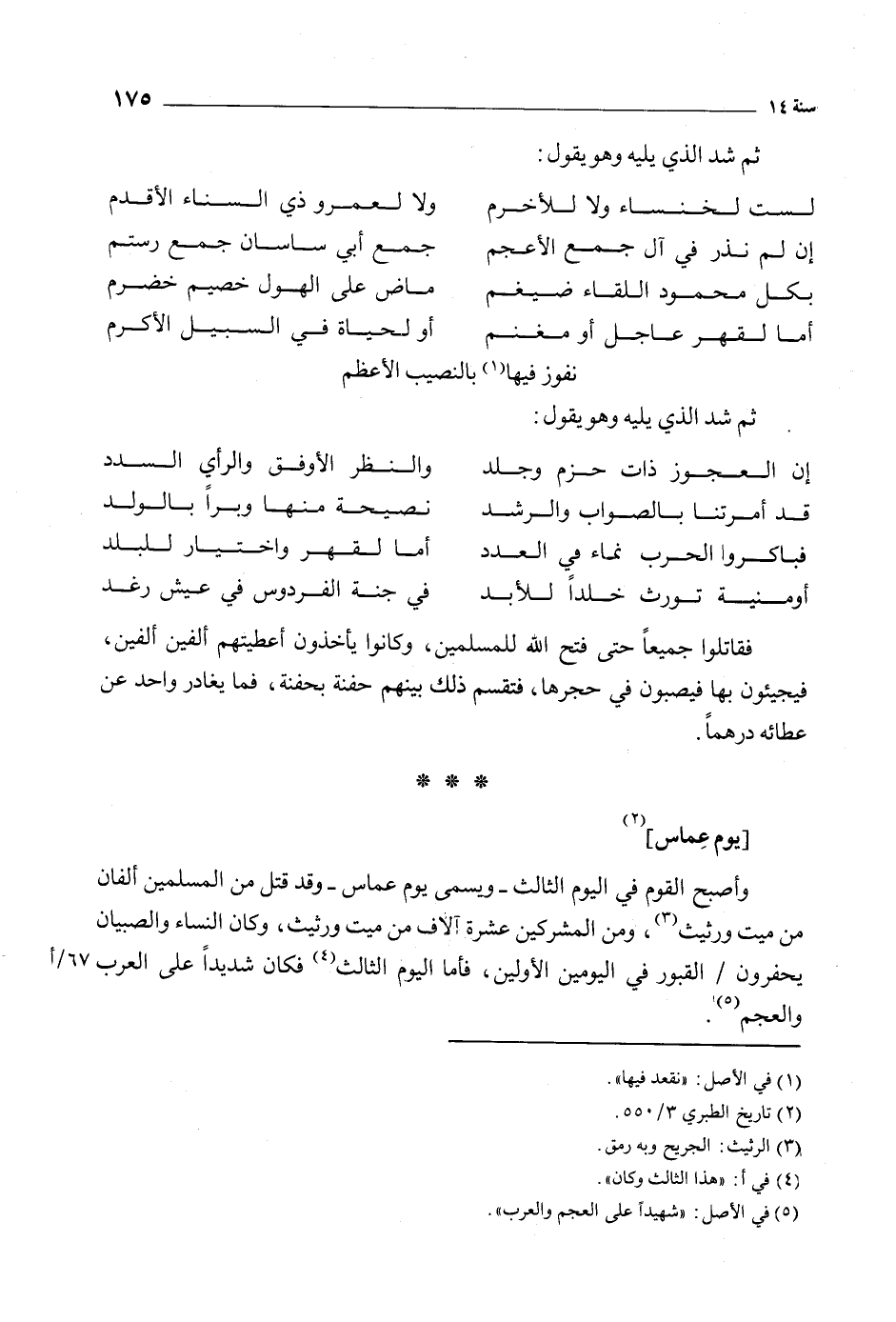 [2] وأصبح القوم في اليوم الثالث- ويسمى يوم عماس- وقد قتل من المسلمين ألفان من ميت ورثيث [3] ، ومن المشركين عشرة آلاف من ميت ورثيث، وكان النساء والصبيان يحفرون/ القبور في اليومين الأولين، فأما اليوم الثالث [4] فكان شديدا على العرب والعجم [5] .