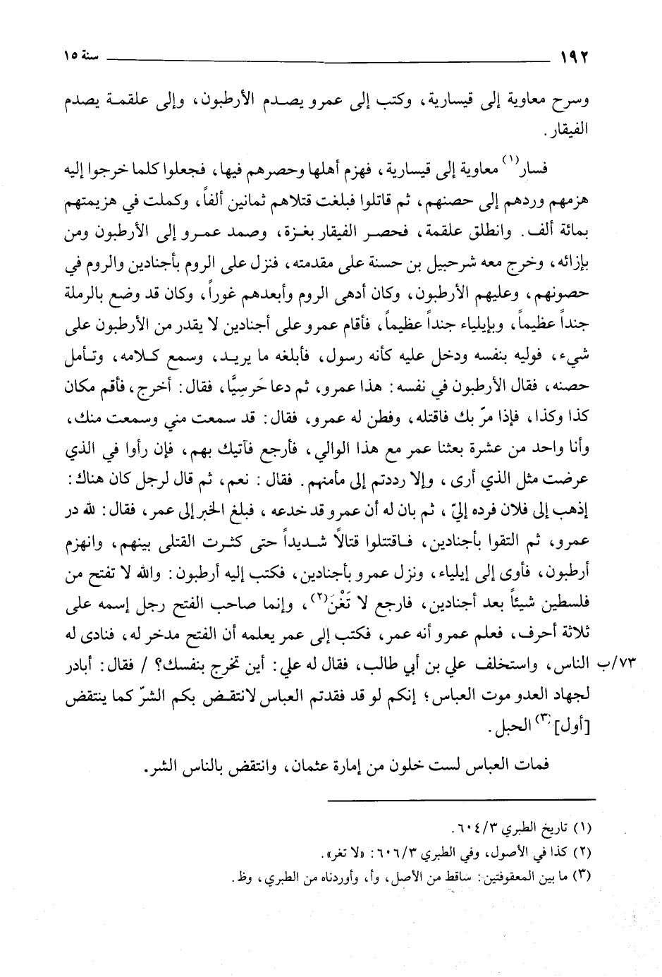 اذهب إلى فلان فرده إلي، ثم بان له أن عمرو قد خدعه، فبلغ الخبر إلى عمر، فقال: للَّه در عمرو، ثم التقوا بأجنادين، فاقتتلوا قتالا شديدا حتى كثرت القتلى بينهم، وانهزم أرطبون، فأوى إلى إيلياء، ونزل عمرو بأجنادين، فكتب إليه أرطبون: والله لا تفتح من فلسطين شيئا بعد أجنادين، فارجع لا تغن [2] ، وإنما صاحب الفتح رجل اسمه عَلَى ثلاثة أحرف، فعلم عمرو أنه عمر، فكتب إلى عمر يعلمه أن الفتح مدخر له، فنادى له النّاس، واستخلف علي بن أبي طالب، فقال له علي: أين تخرج بنفسك؟ / فقال: أبادر لجهاد العدو موت العباس، إنكم لو قد فقدتم العباس لانتقض بكم الشر كما ينتقض [أول] ( [3] الحبل.