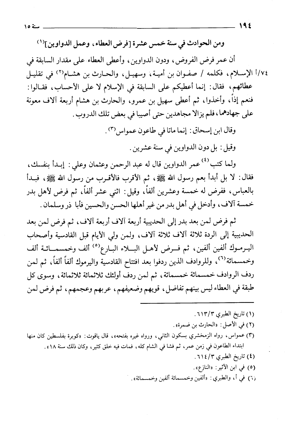 ثم فرض لمن بعد بدر إلى الحديبية أربعة آلاف أربعة آلاف، ثم فرض لمن بعد الحديبية إِلى الردة ثلاثة آلاف ثلاثة آلاف، ولمن ولي الأيام قبل القادسية وأصحاب اليرموك، ألفين ألفين، ثم فرض لأهل البلاء البارع [5] ألف وخمسمائة ألف وخمسمائة [6] ، وللروادف الذين ردفوا بعد افتتاح القادسية واليرموك ألفا ألفا، ثم لمن ردف الروادف خمسمائة خمسمائة، ثم لمن ردف أولئك ثلاثمائة ثلاثمائة، وسوى كل طبقة في العطاء ليس بينهم تفاضل، قويهم وضعيفهم، عربهم وعجمهم، ثم فرض لمن
