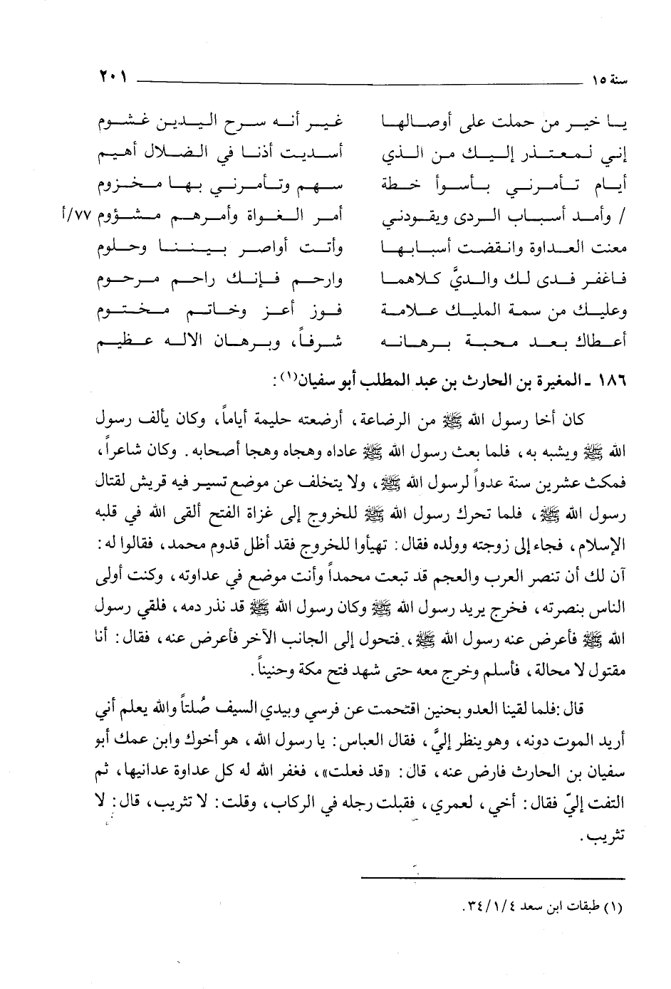 قال: فلما لقينا العدو بحنين اقتحمت عن فرسي وبيدي السيف صلتا والله يعلم أني أريد الموت دونه، وهو ينظر إلي، فقال العباس: يا رسول الله، هو أخوك وابن عمك أبو سفيان بن الحارث فارض عنه، قال: «قد فعلت» ، فغفر الله له كل عداوة عدانيها، ثم التفت إلي فقال: أخي، لعمري، فقبلت رجله في الركاب، وقلت: لا تثريب، قال: لا تثريب.
