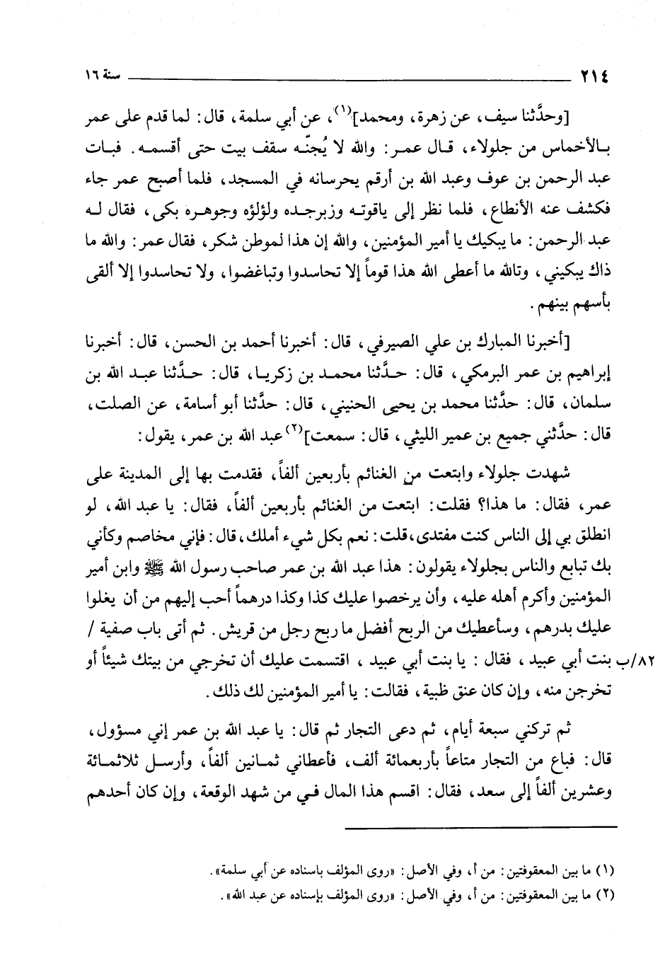 شَهِدْتُ جَلُولاءَ وَابْتَعْتُ مِنَ الْغَنَائِمِ بِأَرْبَعِينَ أَلْفًا، فَقَدِمْتُ بِهَا إِلَى الْمَدِينَةِ عَلَى عُمَرَ، فَقَالَ: مَا هَذَا؟ فَقُلْتُ: ابْتَعْتُ مِنَ الْغَنَائِمِ بِأَرْبَعِينَ أَلْفًا، فَقَالَ: يَا عَبْدَ اللَّهِ، لَوِ انْطُلِقَ بِي إِلَى النَّاسِ كُنْتَ مُفْتَدِي، قُلْتُ: نَعَمْ بِكُلِّ شَيْءٍ أَمْلِكُ، قال: فإنّي مخاصم وكأني بك بتابع وَالنَّاسُ بِجَلُولاءَ يَقُولُونَ: هَذَا عَبْدُ اللَّهِ بْنُ عُمَرَ صَاحِبُ رَسُولِ اللَّهِ صَلَّى اللَّهُ عَلَيْهِ وآله وَسَلَّمَ وَابْنُ أَمِيرُ الْمُؤْمِنِينَ وَأَكْرَمُ أَهْلِهِ عَلَيْهِ، وَأَنْ يُرَخِّصُوا عَلَيْكَ كَذَا وَكَذَا دِرْهَمًا أَحَبُّ إِلَيْهِمْ مِنْ أَنْ يَغُلُّوا عَلَيْكَ بِدِرْهَمٍ، وَسَأُعْطِيكَ مِنَ الرِّبْحِ أَفْضَلَ مَا رَبِحَ رَجُلٌ مِنْ قُرَيْشٍ. ثُمَّ أَتَى بَابَ صَفِيَّةَ/ بِنْتِ أَبِي عُبَيْدٍ، فَقَالَ: يَا بِنْتَ أَبِي عُبَيْدٍ، اقْتَسَمْتُ عَلَيْكِ أَنْ تُخْرِجِي مِنْ بَيْتِكِ شَيْئًا أَوْ تُخْرُجْنَ مِنْهُ، وَإِنْ كَانَ عُنُقَ ظَبْيَةٍ، فَقَالَتْ: يا أمير المؤمنين لَكَ ذَلِكَ.