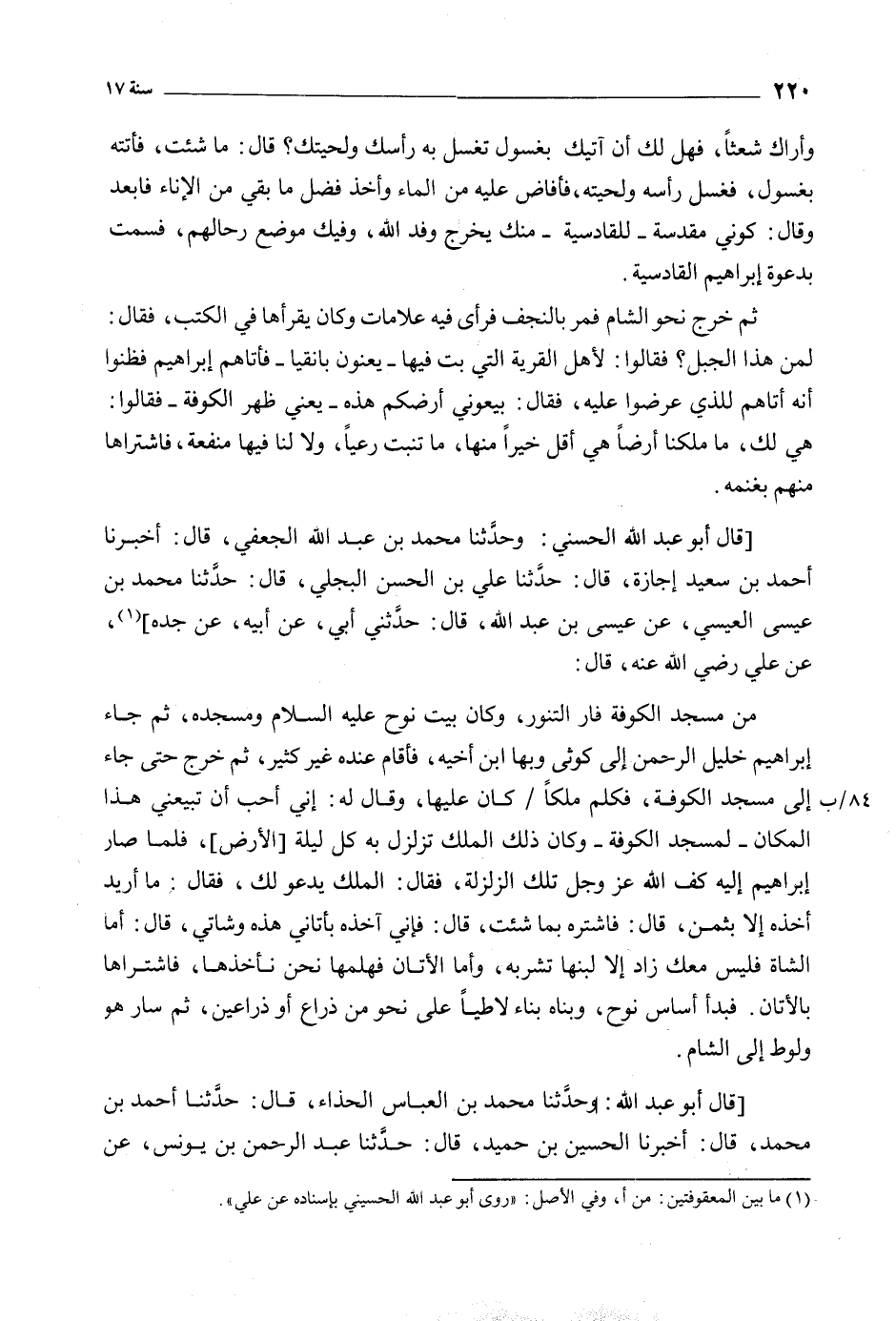 مِنْ مَسْجِدِ الْكُوفَةِ فَارَ التَّنُّورُ، وَكَانَ بَيْتَ نُوحٍ عَلَيْهِ السَّلامُ وَمَسْجِدُهُ، ثُمَّ جَاءَ إِبْرَاهِيمُ خَلِيلُ الرَّحْمَنِ إِلَى كوثى وَبِهَا ابْنُ أَخِيهِ، فَأَقَامَ عِنْدَهُ غَيْرَ كَثِيرٍ، ثُمَّ خَرَجَ حَتَّى جَاءَ إِلَى مَسْجِدِ الْكُوفَةِ، فَكَلَّمَ مَلِكًا/ كَانَ عَلَيْهَا، وَقَالَ لَهُ: إِنِّي أُحِبُّ أَنْ تَبِيعَنِي هَذَا الْمَكَانَ- لِمَسْجِدِ الْكُوفَةِ- وَكَانَ ذَلِكَ الْمَلِكُ تُزَلْزَلُ بِهِ كُلَّ لَيْلَةٍ [الأَرْضُ] ، فَلَمَّا صَارَ إِبْرَاهِيمُ إِلَيْهِ كَفَّ اللَّهُ عَزَّ وَجَلَّ تِلْكَ الزَّلْزَلَةَ، فَقَالَ: الْمَلِكُ يَدْعُو لَكَ، فَقَالَ: مَا أُرِيدُ أَخْذَهُ إلِا بِثَمَنٍ، قَالَ: فَاشْتَرِهِ بِمَا شِئْتَ، قَالَ: فَإِنِّي آخُذُه بِأَتَانِي هَذِهِ وَشَاتِي، قَالَ: أَمَّا الشَّاةُ فَلَيْسَ مَعَكَ زَادٌ إِلا لَبَنُهَا تَشْرَبُهُ، وَأَمَّا الأَتَانُ فَهَلُمَّهَا نَحْنُ نَأْخُذُهَا، فَاشْتَرَاهَا بِالأَتَانِ. فَبَدَأَ أَسَاسَ نُوحٍ، وَبَنَاهُ بِنَاءً لاطِيًا عَلَى نَحْوٍ مِنْ ذِرَاعٍ أَوْ ذِرَاعَيْنِ، ثُمَّ سَارَ هُوَ وَلُوطٌ إِلَى الشَّامِ. [قَالَ أَبُو عَبْدِ اللَّهِ: وَحَدَّثَنَا مُحَمَّدُ بْنُ الْعَبَّاسِ الْحَذَّاءُ، قَالَ: حَدَّثَنَا أَحْمَدُ بْنُ مُحَمَّدٍ، قَالَ: أَخْبَرَنَا الْحُسَيْنُ بْنُ حُمَيْدٍ، قَالَ: حَدَّثَنَا عبد الرحمن بن يونس، عن