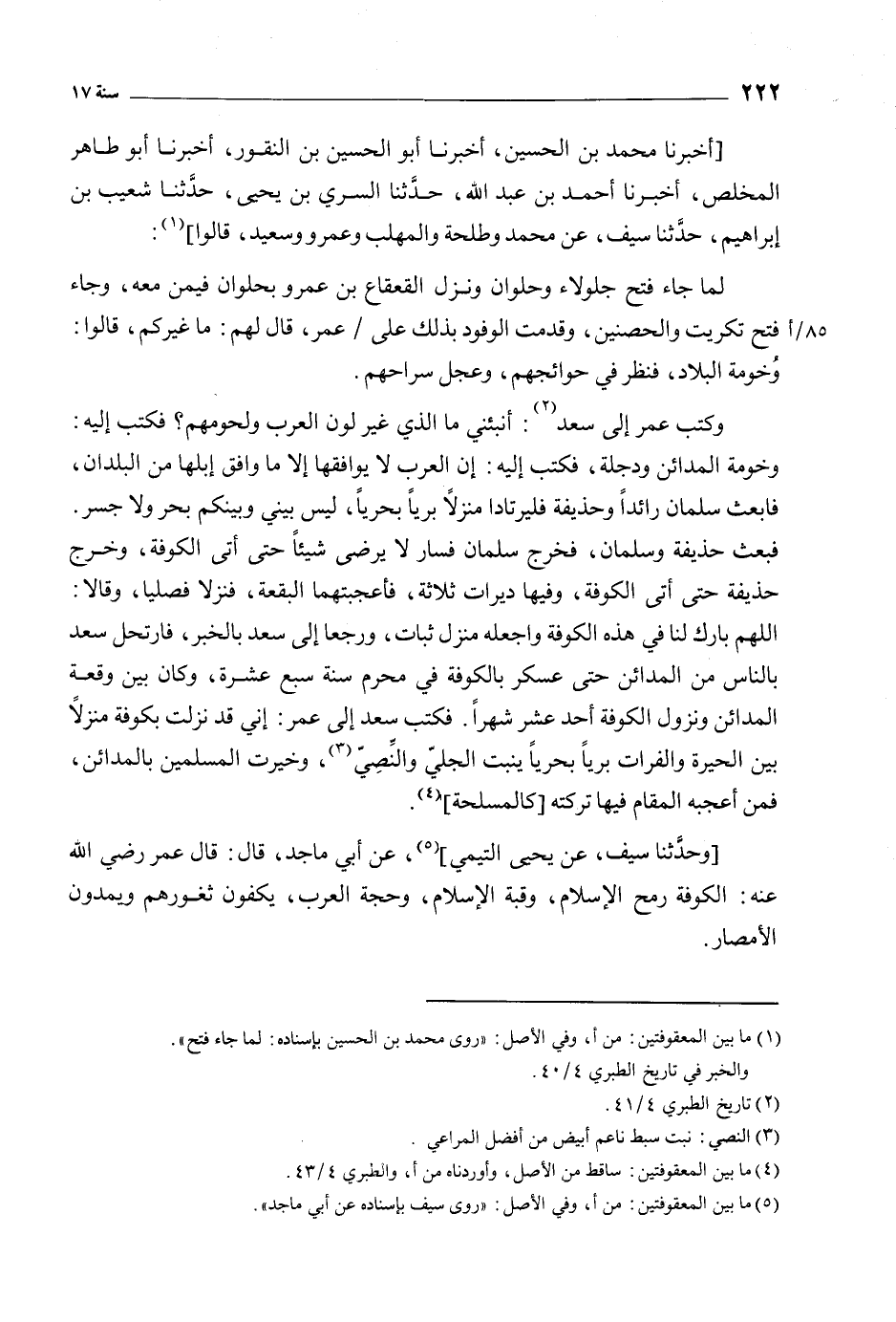 اللَّهمّ بَارِكْ لَنَا فِي هَذِهِ الْكُوفَةِ وَاجْعَلْهُ مَنْزِلَ ثَبَاتٍ، وَرَجَعَا إِلَى سَعْدٍ بِالْخَبَرِ، فَارْتَحَلَ سَعْدٌ بِالنَّاسِ مِنَ الْمَدَائِنِ حَتَّى عَسْكَرَ بِالْكُوفَةِ فِي مَحَرَّمٍ سَنَةَ سَبْعَ عَشَرَةَ، وَكَانَ بين وقعة المدائن ونزول الكوفة أحد عشرا شَهْرًا. فَكَتَبَ سَعْدٌ إِلَى عُمَرَ: إِنِّي قَدْ نَزَلْتُ بِكُوفَةَ مَنْزِلا بَيْنَ الْحِيرَةِ وَالْفُرَاتِ بَرِّيًّا بَحْرِيًّا يُنْبِتُ الْجَلِيَّ وَالنَّصِيَّ [3] ، وَخَيَّرْتُ الْمُسْلِمِينَ بِالْمَدَائِنِ، فَمَنْ أَعْجَبَهُ الْمُقَامُ فِيهَا تَرَكْتُهُ [كَالْمَسْلَحَةِ] [4] .