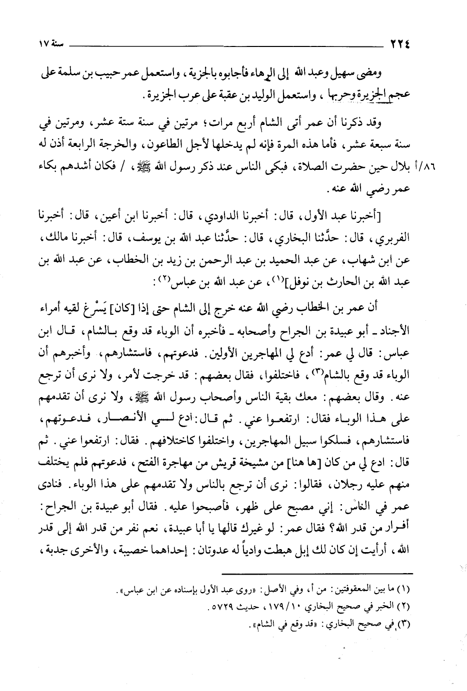 أَنَّ عُمَرَ بْنَ الْخَطَّابِ رَضِيَ اللَّهُ عَنْهُ خَرَجَ إِلَى الشَّامِ حَتَّى إِذَا [كَانَ] يَسْرَغُ لَقِيَهُ أُمَرَاءُ الأَجْنَادِ- أَبُو عُبَيْدَةَ بْنُ الْجَرَّاحِ وَأَصْحَابُهُ- فَأَخْبَرَهُ أَنَّ الْوَبَاءَ قَدْ وَقَعَ بِالشَّامِ، قَالَ ابْنُ عَبَّاسٍ: قَالَ لِي عُمَرُ: ادْعُ لِيَ الْمُهَاجِرِينَ الأَوَّلِينَ. فَدَعَوْتُهُمْ، فَاسْتَشَارَهُمْ، وَأَخْبَرَهُمْ أَنَّ الْوَبَاءَ قَدْ وقع بالشام [3] ، فَاخْتَلَفُوا، فَقَالَ بَعْضُهُمْ: قَدْ خَرَجْتَ لأَمْرٍ، وَلا نَرَى أَنْ تَرْجِعَ عَنْهُ. وَقَالَ بَعْضُهُمْ: مَعَكَ بَقِيَّةُ النَّاسِ وَأَصْحَابُ رَسُولِ اللَّهِ صَلَّى اللَّهُ عليه وآله وَسَلَّمَ، وَلا نَرَى أَنْ تُقْدِمَهُمْ عَلَى هَذَا الْوَبَاءِ فَقَالَ: ارْتَفِعُوا عَنِّي. ثُمَّ قَالَ: ادْعُ لِيَ الأَنْصَارَ، فَدَعَوْتُهُمْ، فَاسْتَشَارَهُمْ، فَسَلَكُوا سَبِيلَ الْمُهَاجِرِينَ، وَاخْتَلَفُوا كَاخْتِلافِهِمْ. فَقَالَ: ارْتَفِعُوا عَنِّي. ثُمَّ قَالَ: ادع لي من كان [ها هنا] مِنْ مَشْيَخَةِ قُرَيْشٍ مِنْ مُهَاجِرَةِ الْفَتْحِ، فَدَعَوْتُهُمْ فَلَمْ يَخْتَلِفْ مِنْهُمْ عَلَيْهِ رَجُلانِ، فَقَالُوا: نَرَى أَنْ تَرْجِعَ بِالنَّاسِ وَلا تُقْدِمَهُمْ عَلَى هَذَا الْوَبَاءِ. فَنَادَى عُمَرُ فِي النَّاسِ: إِنِّي مُصْبِحٌ عَلَى ظَهْرٍ، فَأَصْبِحُوا عَلَيْهِ. فَقَالَ أَبُو عُبَيْدَةَ بْنُ الْجَرَّاحِ: