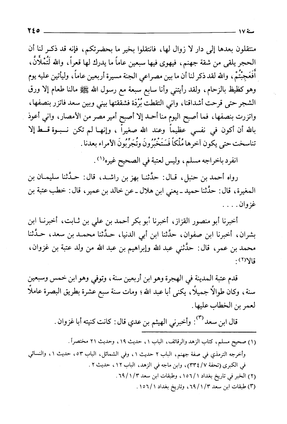 رَوَاهُ أَحْمَدُ بْنُ حَنْبَلٍ، قَالَ: حَدَّثَنَا بَهْزُ بْنُ رَاشِدٍ، قَالَ: حَدَّثَنَا سُلَيْمَانُ بْنُ الْمُغِيرَةِ، قَالَ: حَدَّثَنَا حُمَيْدٌ- يَعْنِي ابْنَ هِلالٍ- عَنْ خَالِدِ بْنِ عُمَيْرٍ، قَالَ: خَطَبَ عُتْبَةُ بْنُ غَزْوَانَ ...