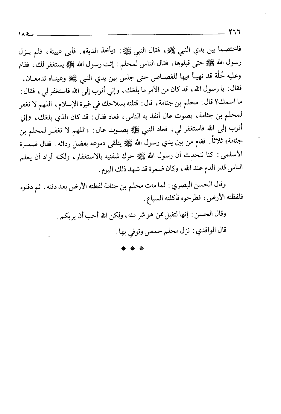 فَاخْتَصَمَا بَيْنَ يَدَيِ النَّبِيِّ صَلَّى اللَّهُ عَلَيْهِ وآله وسلم، فقال النبي صلّى الله عليه وآله وَسَلَّمَ: «يَأْخُذُ الدِّيَةَ» . فَأَبَى عُيَيْنَةُ، فَلَمْ يَزَلْ رسول الله صَلى اللهُ عَلَيه وآله وَسَلَّمَ حَتَّى قَبِلُوهَا، فَقَالَ النَّاسُ لِمُحَلِّمٍ: ائْتِ رَسُولَ الله صلّى الله عليه وآله وَسَلَّمَ يَسْتَغْفِرْ لَكَ، فَقَامَ وَعَلَيْهِ حُلَّةٌ قَدْ تَهَيَّأَ فِيهَا لِلْقَصَاصِ حَتَّى جَلَسَ بَيْنَ يَدَيِ النبي صلّى الله عليه وآله وَسَلَّمَ وَعَيْنَاهُ تَدْمَعَانِ، فَقَالَ: يَا رَسُولَ اللَّهِ، قَدْ كَانَ مِنَ الأَمْرِ مَا بَلَغَكَ، وَإِنِّي أَتُوبُ إِلَى اللَّهِ فَاسْتَغْفِرْ لِي، فَقَالَ:
