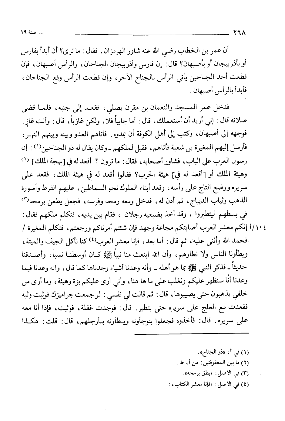 فَوَجَّهَهُ إِلَى أَصْبَهَانَ، وَكَتَبَ إِلَى أَهْلِ الْكُوفَةِ أَنْ يُمِدُّوهُ. فَأَتَاهُمُ الْعَدُوُّ وَبَيْنَهُ وَبَيْنَهُمُ النَّهْرُ، فَأَرْسَلَ إِلَيْهِمُ الْمُغِيرَةَ بْنَ شُعْبَةَ فَأَتَاهُمْ، فَقِيلَ لِمَلِكِهِمْ- وَكَانَ يُقَالُ لَهُ ذُو الْجَنَاحَيْنِ [1] : إِنَّ رَسُولَ الْعَرَبِ عَلَى الْبَابِ، فَشَاوَرَ أَصْحَابَهُ، فَقَالَ: مَا تَرَوْنَ؟ أَقْعُدُ لَهُ فِي [بَهْجَةِ الْمُلْكِ] [2] وَهَيْئَةِ الْمُلْكِ أَوْ [أَقْعُدُ لَهُ فِي] هَيْئَةِ الْحَرْبِ؟ فَقَالُوا اقْعُدْ لَهُ فِي هَيْئَةِ الْمُلْكِ، فَقَعَدَ عَلَى سَرِيرِهِ وَوَضَعَ التَّاجَ عَلَى رَأْسِهِ، وَقَعَدَ أَبْنَاءُ الْمُلُوكِ نَحْوَ السِّمَاطَيْنِ، عَلَيْهِم الْقُرُطُ وَأَسْوِرَةُ الذَّهَبِ وَثِيَابُ الدِّيبَاجِ، ثُمَّ أَذِنَ لَهُ، فَدَخَلَ وَمَعَهُ رُمْحُهُ وَفَرُسُهُ، فَجَعَلَ يَطْعَنُ بِرُمْحِهِ [3] فِي بُسُطِهِمْ لِيَتَطَيَّرُوا، وَقَدْ أَخَذَ بِضَبْعَيْهِ رَجُلانِ، فَقَامَ بَيْنَ يَدَيْهِ، فَتَكَلَّمَ مَلِكُهُمْ فَقَالَ: