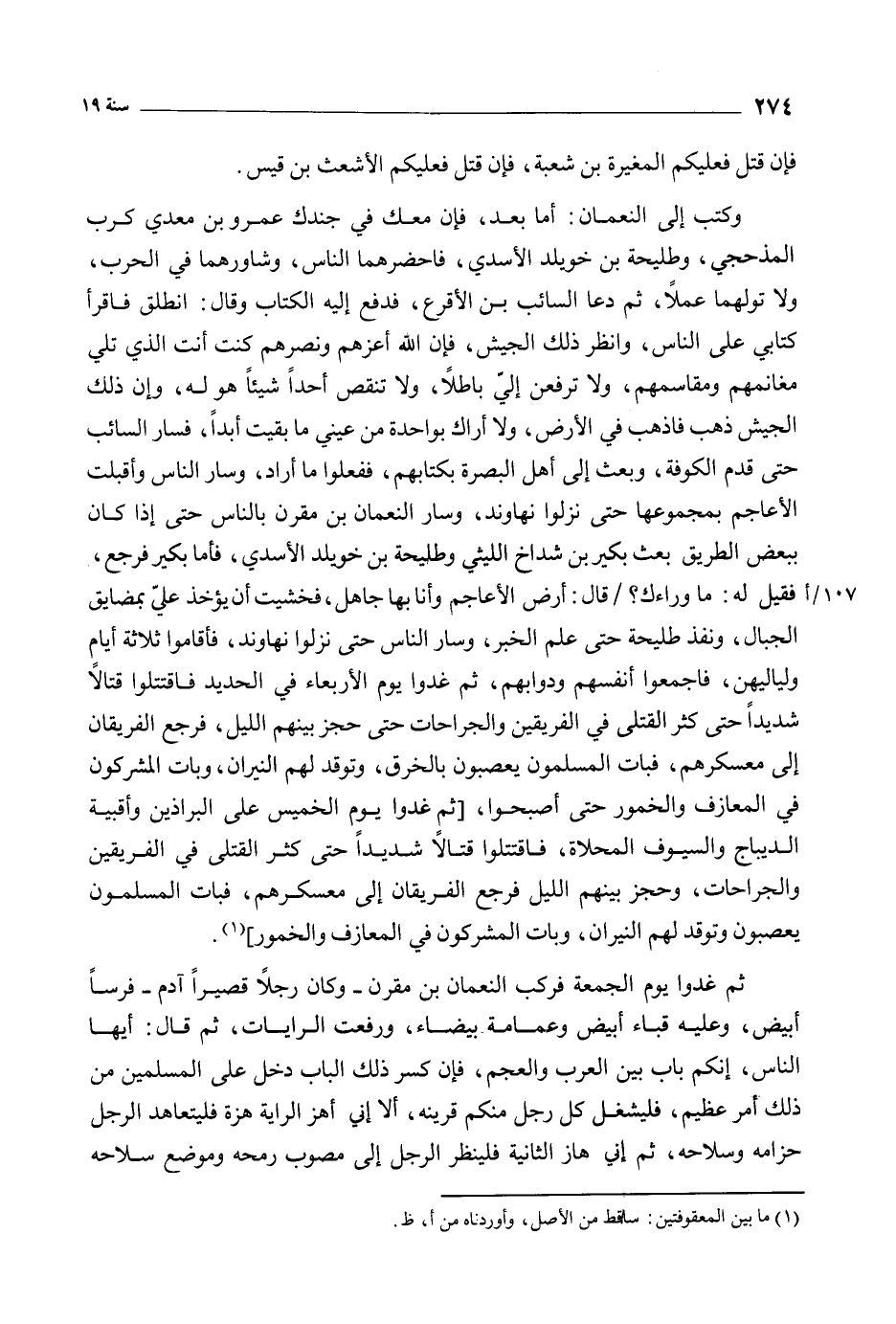وَكَتَبَ إِلَى النُّعْمَانِ: أَمَّا بَعْدُ، فَإِنَّ مَعَكَ فِي جُنْدِكَ عَمْرَو بْنَ مَعْدِيَكْرُبَ الْمُذْحَجِيَّ، وَطُلَيْحَةَ بْنَ خُوَيْلِدٍ الأَسَدِيَّ، فَأَحْضِرْهُمَا النَّاسَ، وَشَاوِرْهُمَا فِي الْحَرْبِ، وَلا تُوَلِّهِمَا عَمَلا، ثُمَّ دَعَا السَّائِبَ بْنَ الأَقْرَعِ، فَدَفَعَ إِلَيْهِ الْكِتَابَ وَقَالَ: انْطَلِقْ فَاقْرَأْ كِتَابِي عَلَى النَّاسِ، وَانْظُرْ ذَلِكَ الْجَيْشَ، فَإِنِ اللَّهُ أَعَزَّهُمْ وَنَصَرَهُمْ كُنْتَ أَنْتَ الَّذِي تَلِي مَغَانِمَهُمْ وَمَقَاسِمَهُمْ، وَلا تَرْفَعَنَّ إِلَيَّ بَاطِلا، وَلا تُنْقِصْ أَحَدًا شَيْئًا هُوَ لَهُ، وَإِنْ ذَلِكَ الْجَيْشُ ذَهَبَ فَاذْهَبْ فِي الأَرْضِ، وَلا أَرَاكَ بِوَاحِدَةٍ مِنْ عَيْنَيَّ مَا بَقِيتُ أَبَدًا، فَسَارَ السَّائِبُ حَتَّى قَدِمَ الْكُوفَةَ، وَبَعَثَ إِلَى أَهْلِ الْبَصْرَةِ بِكِتَابِهِمْ، فَفَعَلُوا مَا أَرَادَ، وَسَارَ النَّاسُ وَأَقْبَلَتِ الأَعَاجِمُ بِمَجْمُوعِهَا حَتَّى نَزَلُوا نَهَاوَنْدَ، وَسَارَ النُّعْمَانُ بن مقرن بالناس حَتَّى إِذَا كَانَ بِبَعْضِ الطَّرِيقِ بَعَثَ بَكِيرَ بْنَ شَدَّاخٍ اللَّيْثِيَّ وَطُلَيْحَةَ بْنَ خُوَيْلِدٍ الأَسَدِيَّ، فَأَمَّا بَكِيرُ فَرَجَعَ، فَقِيلَ لَهُ: مَا وَرَاءَكَ؟ / قَالَ: أَرْضُ الأَعَاجِمِ وَأَنَا بِهَا جَاهِلٌ، فَخَشِيتُ أَنْ يُؤْخَذَ عَلَيَّ بِمَضَايِقِ الْجِبَالِ، وَنَفَذَ طُلَيْحَةُ حَتَّى عَلِمَ الْخَبَرَ، وَسَارَ النَّاسُ حَتَّى نَزَلُوا نَهَاوَنْدَ، فَأَقَامُوا ثَلاثَةَ أَيَّامٍ وَلَيَالِيهِنَّ، فَأَجْمَعُوا أَنْفُسَهُمْ وَدَوَابَّهُمْ، ثُمَّ غَدُوا يَوْمَ الأَرْبِعَاءِ فِي الْحَدِيدِ فَاقْتَتَلُوا قِتَالا شَدِيدًا حَتَّى كَثُرَ الْقَتْلَى فِي الْفَرِيقَيْنِ وَالْجِرَاحَاتُ حَتَّى حَجَزَ بَيْنَهُمُ اللَّيْلُ، فَرَجَعَ الْفَرِيقَانِ إِلَى مُعَسْكَرِهِمْ، فَبَاتَ الْمُسْلِمُونَ يُعَصِّبُونَ بِالْخِرَقِ، وَتُوقَدُ لَهُمُ النِّيرَانُ، وَبَاتَ الْمُشْرِكُونَ فِي الْمَعَازِفِ وَالْخُمُورِ حَتَّى أَصْبَحُوا، [ثُمَّ غَدُوا يَوْمَ الْخَمِيسِ عَلَى الْبَرَاذِينَ وَأَقْبِيَةِ الدِّيبَاجِ وَالسُّيُوفِ الْمُحَلاةِ، فَاقْتَتَلُوا قِتَالا شَدِيدًا حَتَّى كَثُرَ الْقَتْلَى فِي الْفَرِيقَيْنِ والجراحات، وَحَجَزَ بَيْنَهُمُ اللَّيْلُ فَرَجَعَ الْفَرِيقَانِ إِلَى مُعَسْكَرِهِمْ، فَبَاتَ الْمُسْلِمُونَ يُعَصِّبُونَ وَتُوقَدُ لَهُمُ النِّيرَانُ، وَبَاتَ الْمُشْرِكُونَ فِي الْمَعَازِفِ وَالْخُمُورِ] [1] .