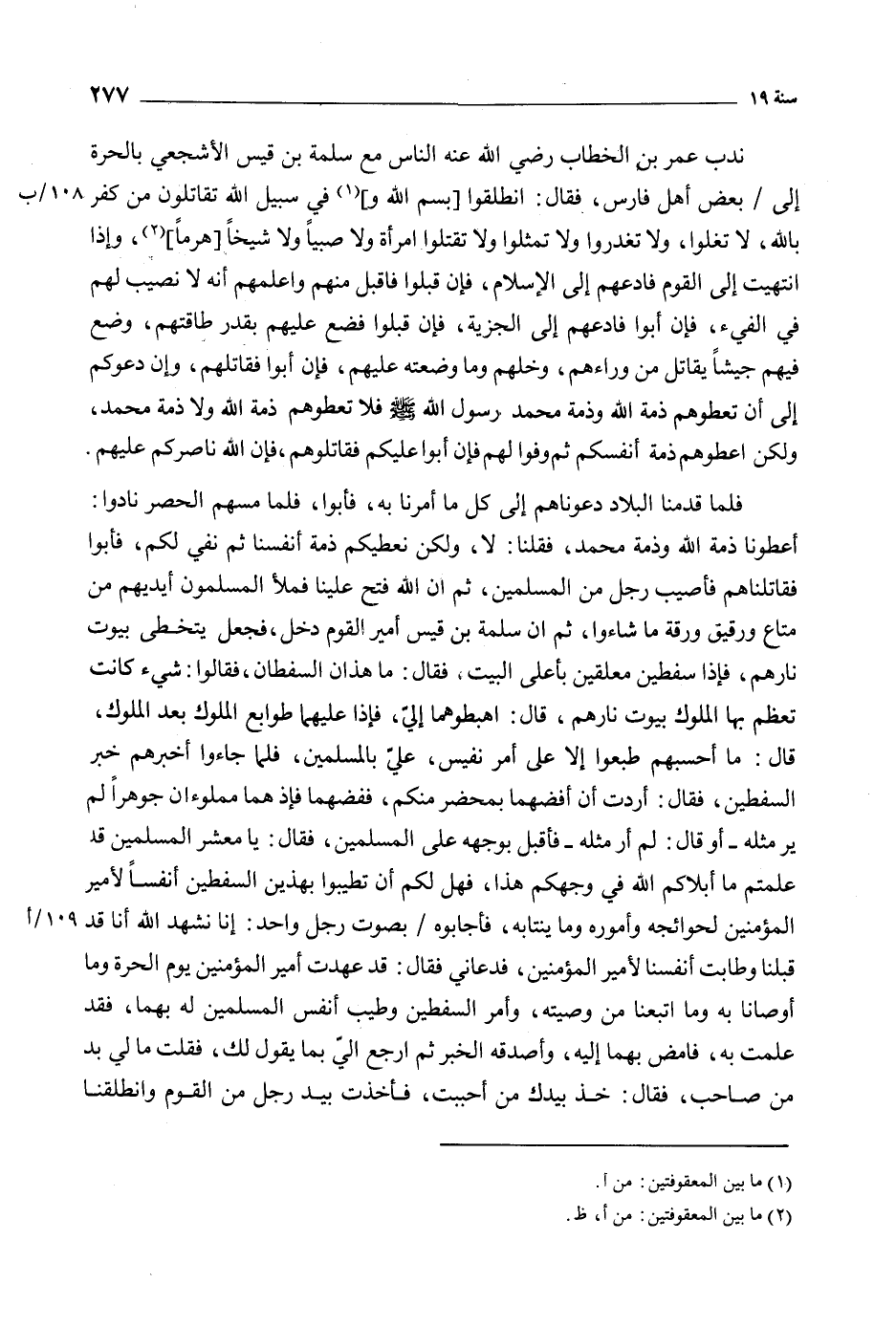 نَدَبَ عُمَرُ بْنُ الْخَطَّابِ رَضِيَ اللَّهُ عَنْهُ النَّاسَ مَعَ سَلَمَةَ بْنِ قَيْسٍ الأَشْجَعِيِّ بِالْحَرَّةِ إِلَى/ بَعْضِ أَهْلِ فَارِسَ، فَقَالَ: انْطَلِقُوا [بِسْمِ الله و] [1] في سَبِيلِ اللَّهِ تُقَاتِلُونَ مَنْ كَفَرَ باللَّه، لا تُغْلُوا، وَلا تَغْدِرُوا وَلا تُمَثِّلُوا وَلا تَقْتُلُوا امْرَأَةً وَلا صَبِيًّا وَلا شَيْخًا [هَرِمًا] [2] ، وَإِذَا انْتَهَيْتَ إِلَى الْقَوْمِ فَادْعُهُمْ إِلَى الإِسْلامِ، فَإِن قَبِلُوا فَاقْبَلْ مِنْهُمْ وَأَعْلِمْهُمْ أَنَّهُ لا نَصِيبَ لَهُمْ فِي الْفَيْءِ، فَإِن أَبَوْا فَادْعُهُمْ إِلَى الْجِزْيَةِ، فَإِنْ قَبِلُوا فَضَعْ عَلَيْهِمْ بِقَدْرِ طَاقَتِهِمْ، وضع فيهم جيشا يقاتل من وراءهم، وَخَلِّهِمْ وَمَا وَضَعْتَهُ عَلَيْهِمْ، فَإِنْ أَبَوْا فَقَاتِلْهُمْ، وَإِنْ دَعَوْكُمْ إِلَى أَنْ تُعْطُوهُمْ ذِمَّةَ اللَّهِ وَذِمَّةَ مُحَمَّدٍ رَسُولِ اللَّهِ صَلَّى اللَّهُ عَلَيْهِ وآله وَسَلَّمَ فَلا تُعْطُوهُمْ ذِمَّةَ اللَّهِ وَلا ذِمَّةَ محمد، وَلَكِنْ أَعْطُوهُمْ ذِمَّةَ أَنْفُسِكُمْ ثُمَّ وَفُّوا لَهُمْ فَإِنْ أَبَوْا عَلَيْكُمْ فَقَاتِلُوهُمْ، فَإِنَّ اللَّهَ نَاصِرُكُمْ عَلَيْهِمْ.