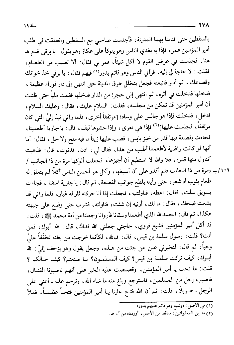 بِالسِّفْطَيْنِ حَتَّى قَدِمْنَا بِهِمَا الْمَدِينَةَ، فَأَجْلَسْتُ صَاحِبَيَّ مَعَ السِّفْطَيْنِ وَانْطَلَقْتُ فِي طَلَبِ أَمِيرِ الْمُؤْمِنيِنَ عُمَرَ، فَإِذَا بِهِ يُغَدِّي النَّاسَ وَهُوَ يَتَوَكَّأُ عَلَى عُكَّازٍ وَهُوَ يَقُولُ: يَا بَرْقِيُّ ضَعْ هَا هُنَا. فَجَلَسْتُ فِي عرْضِ الْقَوْمِ لا آكُلُ شَيْئًا، فَمَرَّ بِي فَقَالَ: أَلا تُصِيبُ مِنَ الطَّعَامِ، فَقُلْتُ: لا حَاجَةَ لِي إِلَيْهِ، فَرَآنِي النَّاسُ وَهُوَ قَائِمٌ يَدُورُ [1] فِيهِمْ فَقَالَ: يَا بَرْقِيُّ خُذْ خِوَانَكَ وَقِصَاعَكَ، ثُمَّ أَدْبَرَ فَاتَّبَعْتُهُ فَجَعَلَ يَتَخَلَّلُ طُرُقَ الْمَدِينَةِ حَتَّى انْتَهَى إِلَى دَارٍ قَوْرَاءَ عَظِيمَةٍ، فَدَخَلَهَا فَدَخَلْتُ فِي أَثَرِهِ، ثُمَّ انْتَهَى إِلَى حُجْرَةٍ مِنَ الدَّارِ فَدَخَلَهَا فَقُمْتُ مَلِيًّا حَتَّى ظَنَنْتُ أَنَّ أَمِيرَ الْمُؤْمِنيِنَ قَدْ تَمَكَّنَ مِنْ مَجْلِسِهِ، فَقُلْتُ: السَّلامُ عَلَيْكَ، فَقَالَ: وَعَلَيْكَ السَّلامُ، ادْخُلْ، فَدَخَلْتُ فَإِذَا هُوَ جَالِسٌ عَلَى وِسَادَةٍ [مُرْتَفِقًا أُخْرَى، فَلَمَّا رَآنِي نَبَذَ إِلَيَّ الَّتِي كَانَ مُرْتَفِقًا، فَجَلَسْتُ عَلَيْهَا] [2] فَإِذَا هِيَ تَعْرَى، وَإِذَا حَشْوُهَا لِيفٌ، قَالَ: يَا جَارِيَةُ أَطْعِمِينَا، فَجَاءَتْ بِقَصْعَةٍ فِيهَا قَدْرٌ مِنْ خُبْزٍ يَابِسٍ، فَصَبَّ عَلَيْهَا زَيْتًا مَا فِيهِ مِلْحٌ وَلا خَلٌّ، فَقَالَ: أَمَا أَنَّهَا لَوْ كَانَت رَاضِيَةٌ لأَطْعَمَتْنَا أَطْيَبَ مِنْ هَذَا، فَقَالَ لِي: ادْنُ، فَدَنَوْتُ، قَالَ: فَذَهَبْتُ أَتَنَاوَلُ مِنْهَا قَدْرَهُ، فَلا وَاللَّهِ لا أَسْتَطِيعُ أَنْ أُجِيزَهَا، فَجَعَلْتُ أَلُوكُهَا مَرَّةً مِنْ ذَا الْجَانِبِ/ وَمَرَّةً مِنْ ذَا الْجَانِبِ فَلَمْ أَقْدِرْ عَلَى أَنْ أَسِيغَهَا، وَأَكَلَ هُوَ أَحْسَنُ النَّاسِ أَكْلا لَمْ يَتَعَلَّقْ لَهُ طَعَامٌ بِثَوْبٍ أَوْ شَعْرٍ، حَتَّى رَأَيْتُهُ يَلْطَعُ جَوَانِبَ الْقَصْعَةِ، ثُمَّ قَالَ: يَا جَارِيَةُ اسْقِنَا، فَجَاءَتْ بِسُوَيْقٍ سُلَّتْ، فَقَالَ: أَعْطِهِ، فَنَاوَلَتْنِيهُ، فَجَعَلْتُ إِذَا أَنَا حَرَّكْتُهُ ثَارَ لَهُ غُبَارٌ، فَلَمَّا رَآنِي قَدْ بَشِعْتُ ضَحِكَ، فَقَالَ: مَا لَكَ، أَرِنِيهُ إِنْ شِئْتَ، فَنَاوَلْتُهُ، فَشَرِبَ حَتَّى وَضَعَ عَلَى جَبْهَتِهِ هَكَذَا، ثُمَّ قَالَ: الْحَمْدُ للَّه الَّذِي أَطْعَمَنَا وَسَقَانَا فَأَرْوَانَا وَجَعَلَنَا مِنْ أُمَّةِ مُحَمَّدٍ صَلَّى اللَّهُ عليه وآله وَسَلَّمَ، قُلْت: