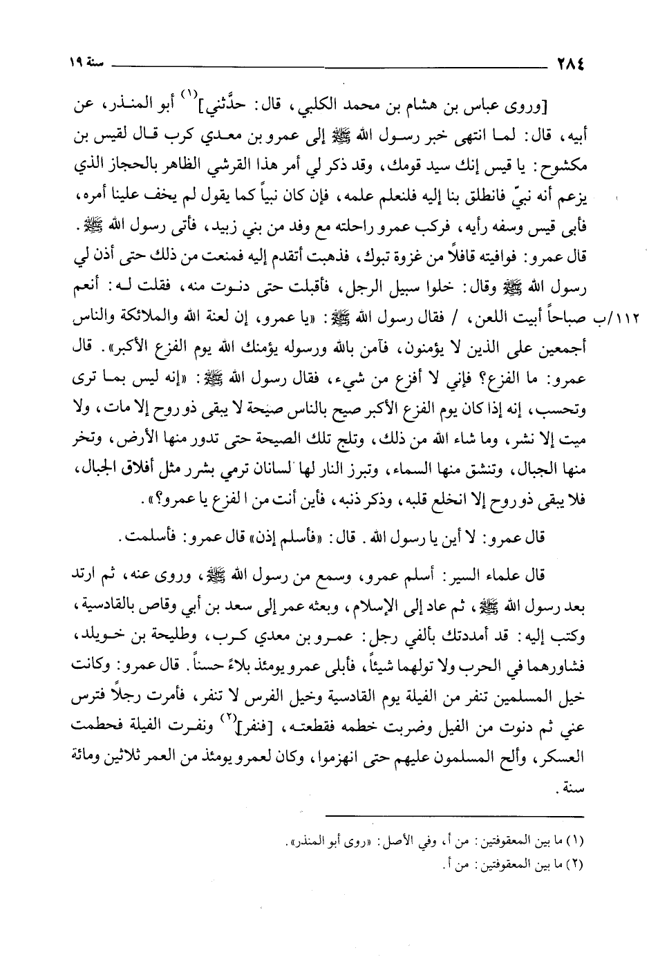 [وَرَوَى عَبَّاسُ بْنُ هِشَامِ بْنِ مُحَمَّدٍ الْكَلْبِيُّ، قَالَ: حَدَّثَنِي] [1] أَبُو الْمُنْذِرِ، عَن أَبِيهِ، قَالَ: لما انتهى خبر رسول الله صَلى اللهُ عَلَيه وآله وَسَلَّمَ إِلَى عَمْرِو بْنِ مَعْدِيَكْرُبَ قَالَ لِقَيْسِ بْنِ مَكْشُوحٍ: يَا قَيْسُ إِنَّكَ سَيِّدُ قَوْمِكَ، وَقَدْ ذكر لِي أَمْرَ هَذَا الْقُرَشِيِّ الظَّاهِرِ بِالْحِجَازِ الَّذِي يَزْعُمُ أَنَّهُ نَبِيٌّ فَانْطَلِقْ بِنَا إِلَيْهِ فَلْنَعْلَمْ عِلْمَهُ، فَإِنْ كَانَ نَبِيًّا كَمَا يَقُولُ لَمْ يَخْفَ عَلَيْنَا أَمْرُهُ، فَأَبَى قَيْسٌ وَسَفَّهَ رَأْيَهُ، فَرَكِبَ عَمْرٌو رَاحِلَتَهُ مَعَ وَفْدٍ مِنْ بَنِي زُبَيْدٍ، فَأَتَى رَسُولَ اللَّهِ صَلَّى اللَّهُ عليه وآله وَسَلَّمَ.