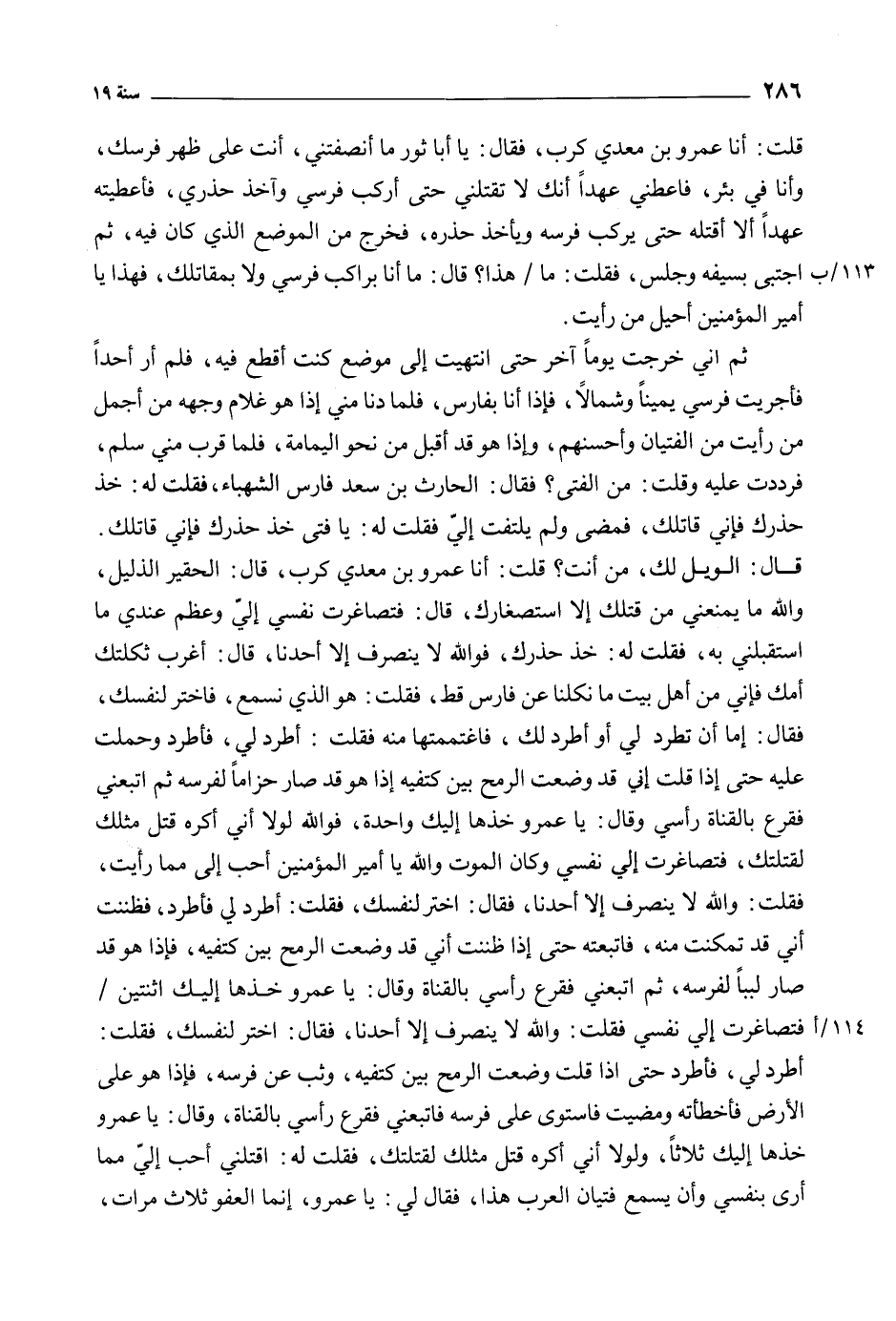 أطرد لي، فأطرد حَتَّى إِذَا قُلْتُ وضعت الرمح بين كتفيه، وثبت عَن فرسه، فَإِذَا هُوَ عَلَى الأرض فأخطأته ومضيت فاستوى عَلَى فرسه فاتبعني فقرع رأسي بالقناة، وَقَالَ: يا عَمْرو خذها إليك ثلاثا، ولولا أني أكره قتل مثلك لقتلتك، فَقُلْتُ لَهُ: اقتلني أحب إلي مِمَّا أرى بنفسي وأن يسمع فتيان العرب هذا، فقال لي: يا عَمْرو، إِنَّمَا العفو ثَلاث مرات،