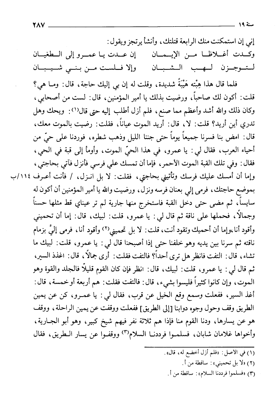 أغذ السير، ففعلت وسمع وقع الخيل عَن قرب، فَقَالَ لي: يا عَمْرو، كن عَن يمين الطريق وقف وحول وجوه دوابنا [إِلَى الطريق] ففعلت ووقفت عن يمين الراحلة، ووقف هُوَ عَن يسارها، ودنا الْقَوْم منا فَإِذَا هم ثلاثة نفر فيهم شيخ كبير، وَهُوَ أَبُو الجارية،: